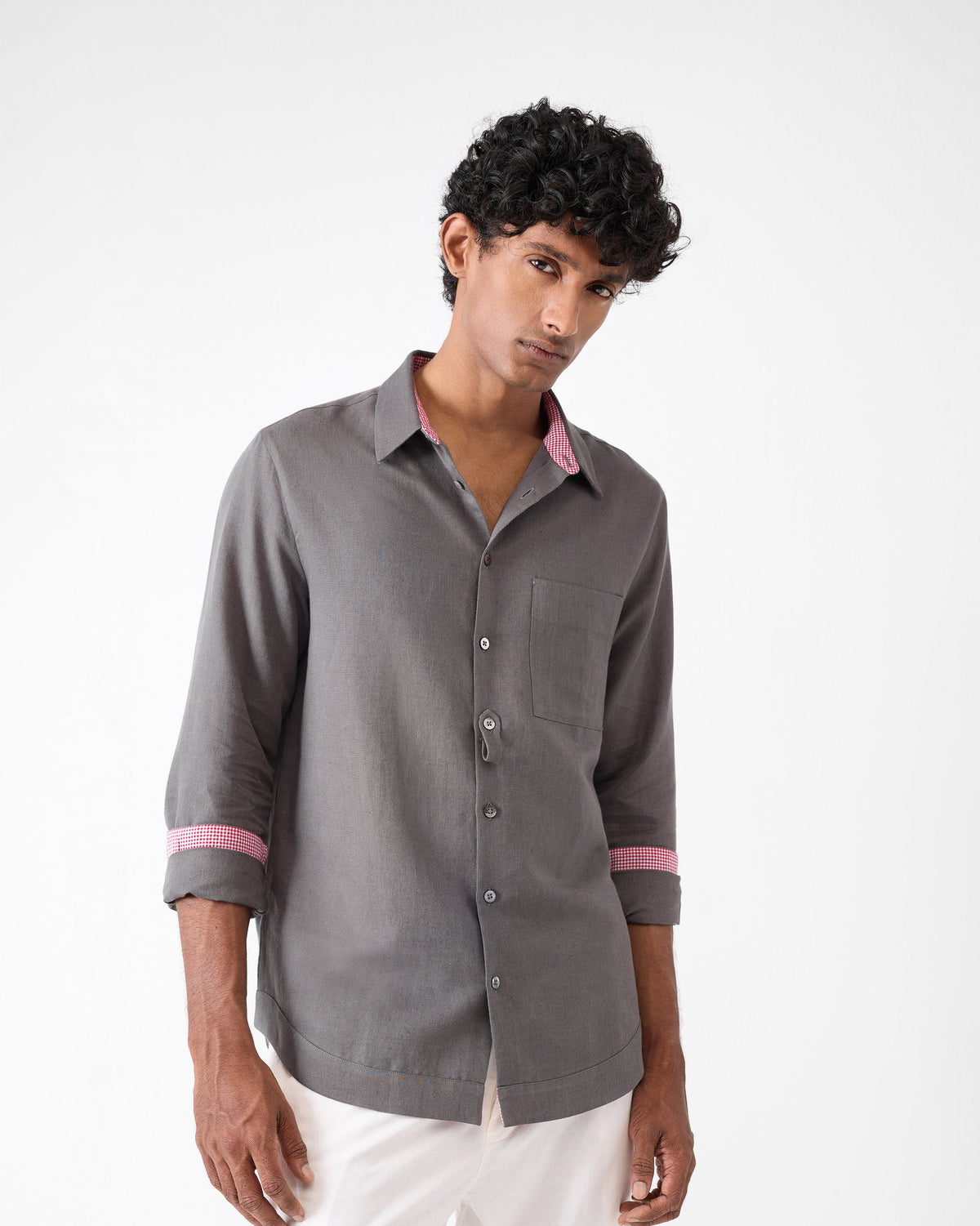 - Crafted in charcoal-toned cotton linen, it features a classic silhouette with star buttons at each sleeve placket and a red-threaded second button at the front.