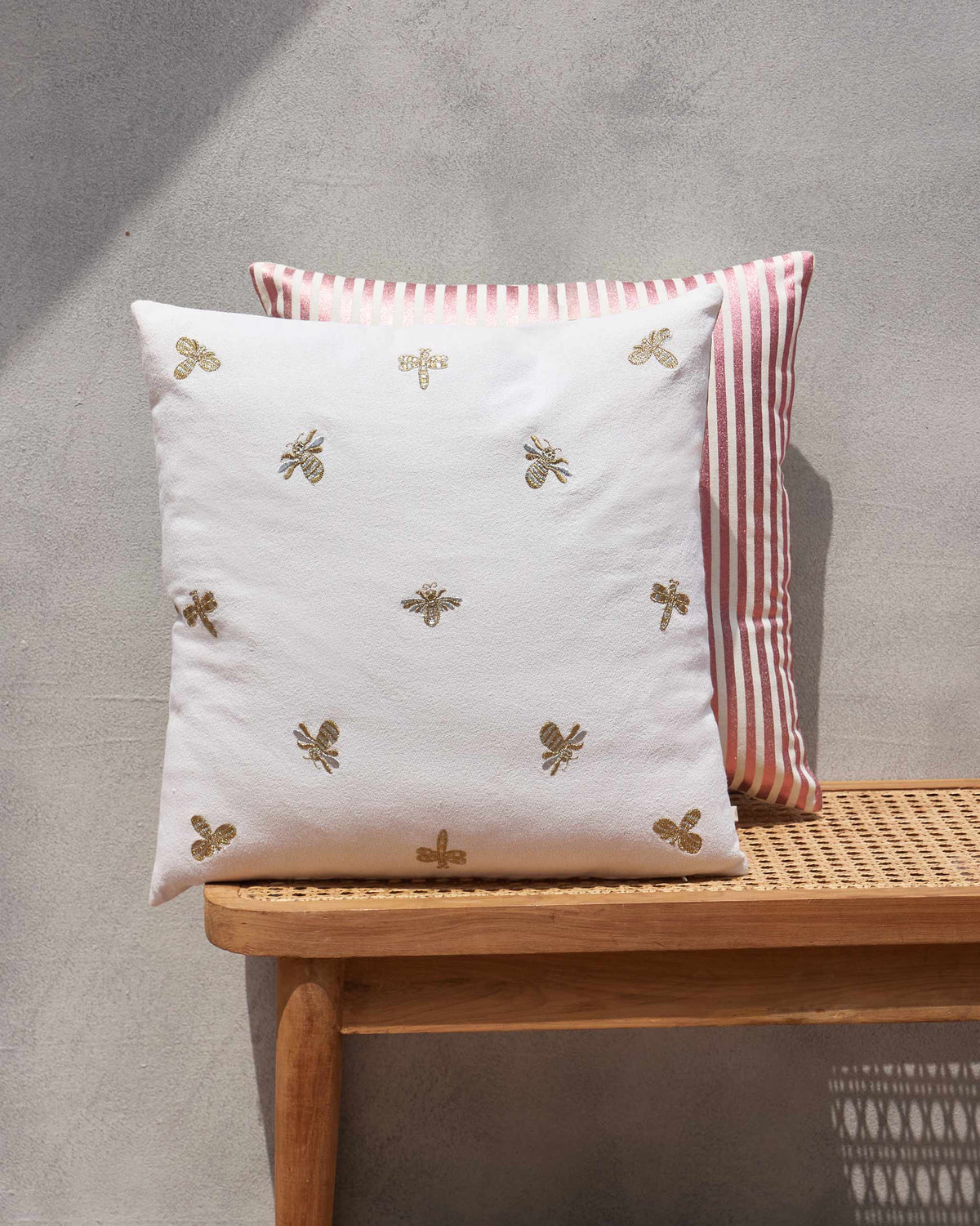 - A sweet addition to your space, the embroidered bees of the Honey Bee cushion cover make a playful addition to rooms. The back of the cushion features a striped gold background, letting you play with the embroidery or stripes for your setting.