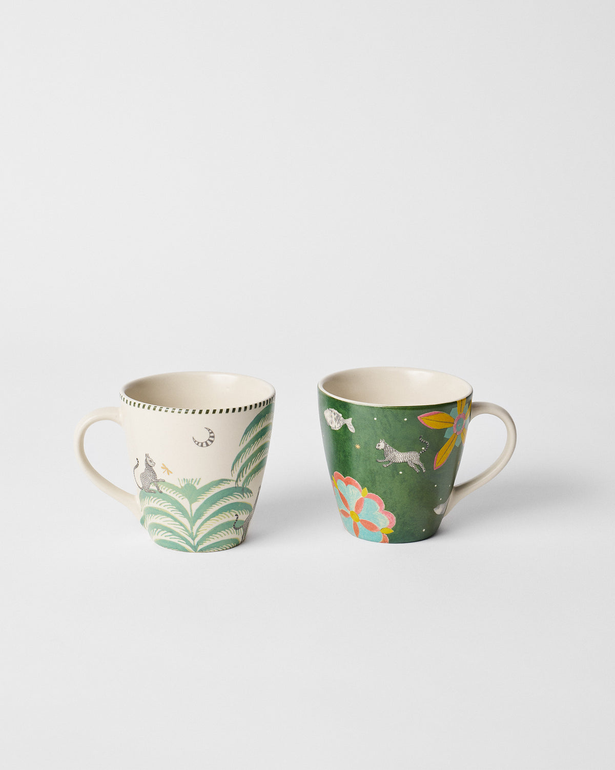 - The Indus Conical Mugs come in a pair—each one bursting with flora and fauna in lush greens, punchy pinks, and bright yellows.