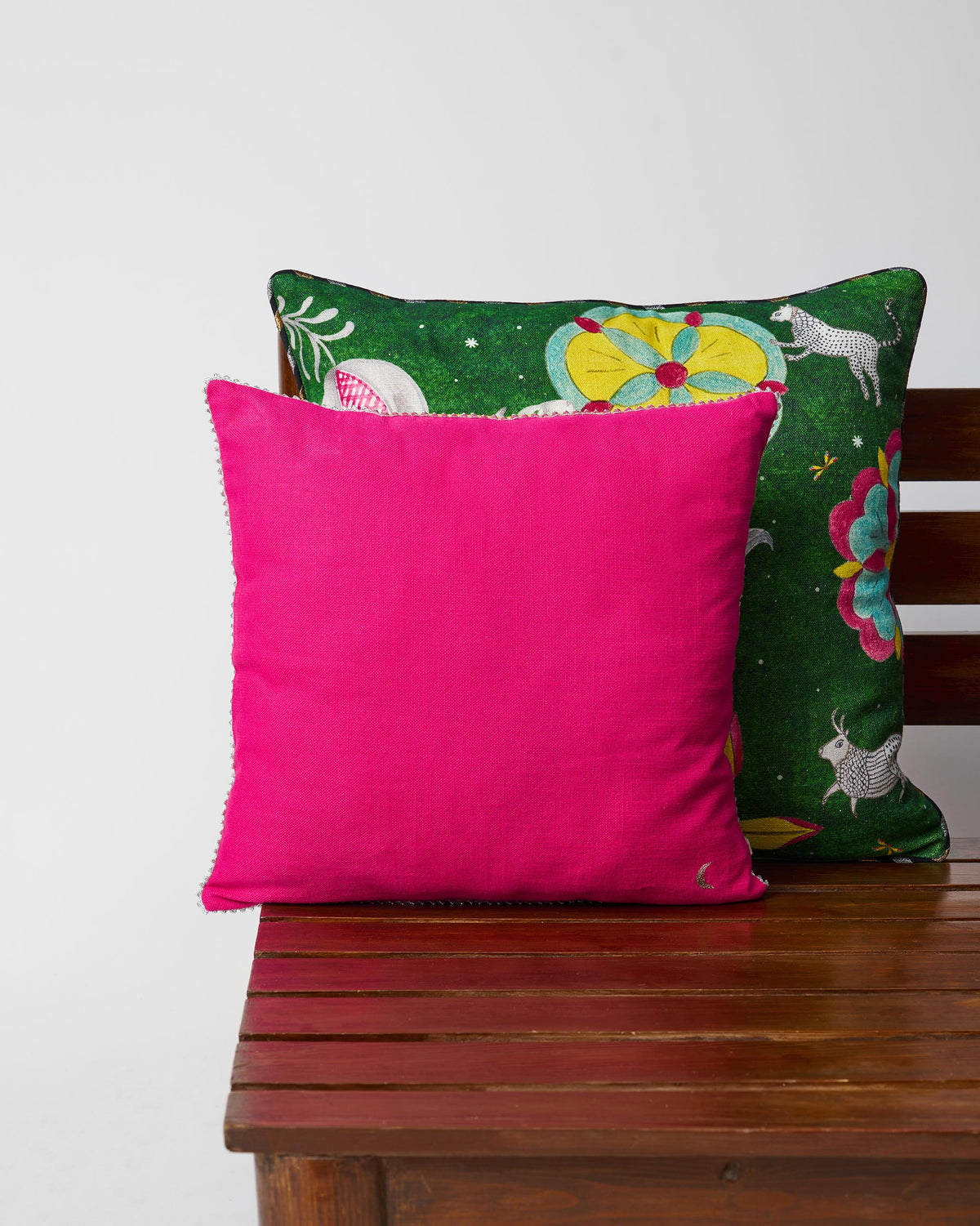 - Brighten up your space with the Indus Lagoon Cushion Cover in vibrant shades of pink and yellow.