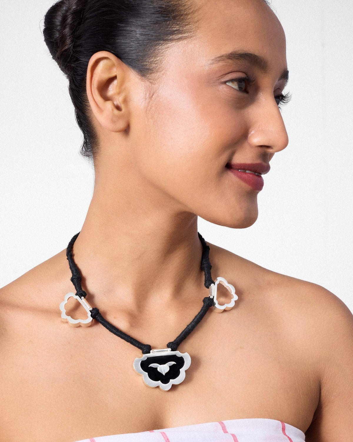 - A headturner, the Kamal Necklace shines in silver plating and bold black thread, featuring lotus-inspired shapes.