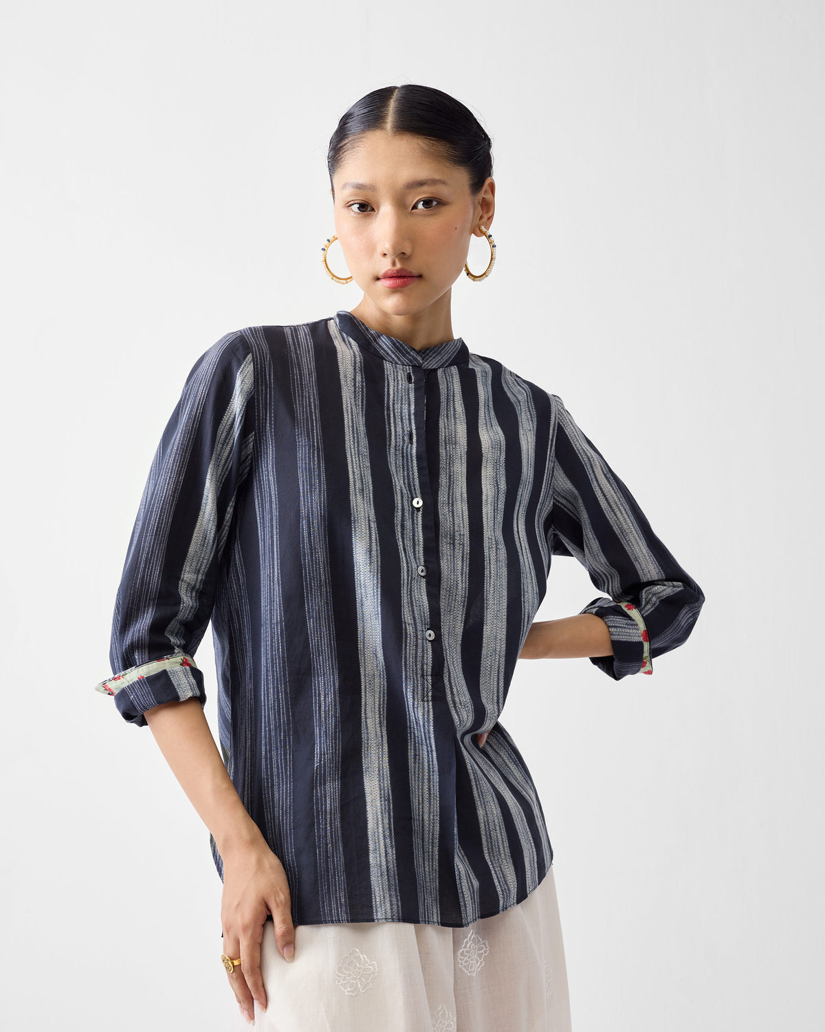 - Crafted in cotton voile using the shibori dyeing technique, it features charcoal and ivory stripes, a mandarin collar, and an easy, relaxed fit.