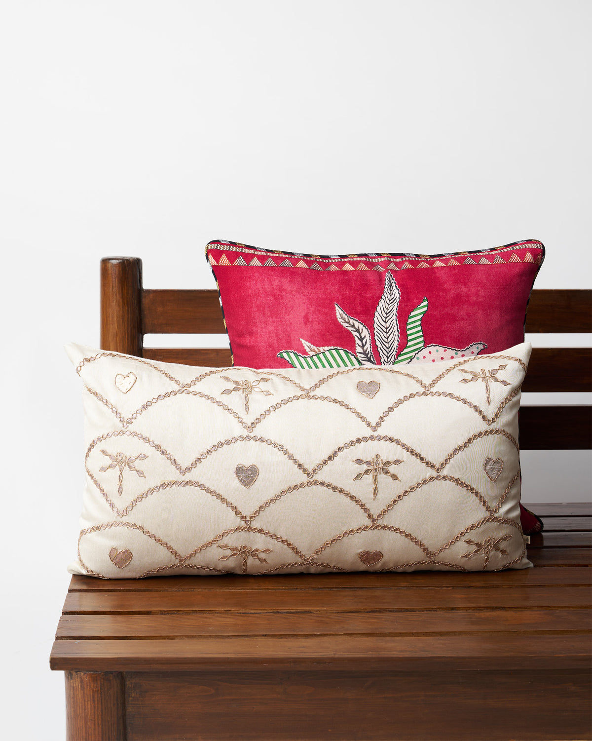 - The cushion is framed with silver gota detailing on all four sides, adding a subtle shimmer and festive elegance to its ivory base.
