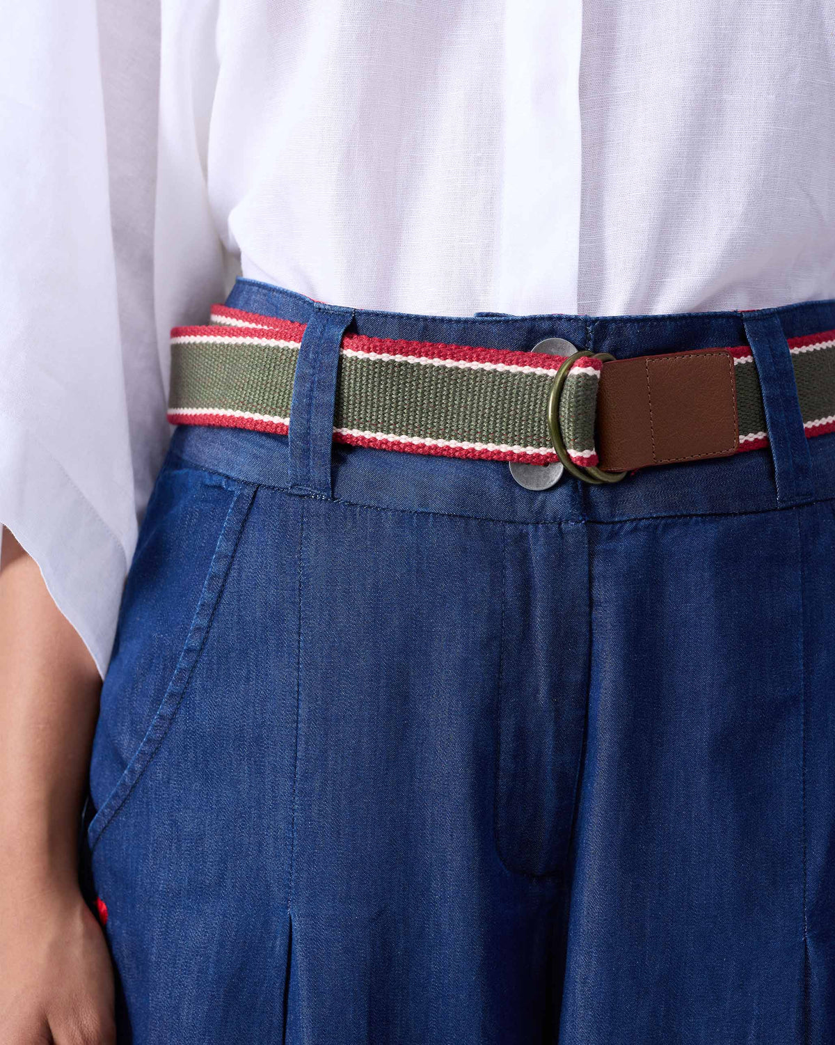 - The Nico Belt is a versatile essential, woven in sturdy cotton webbing with an olive base framed by a red edge.