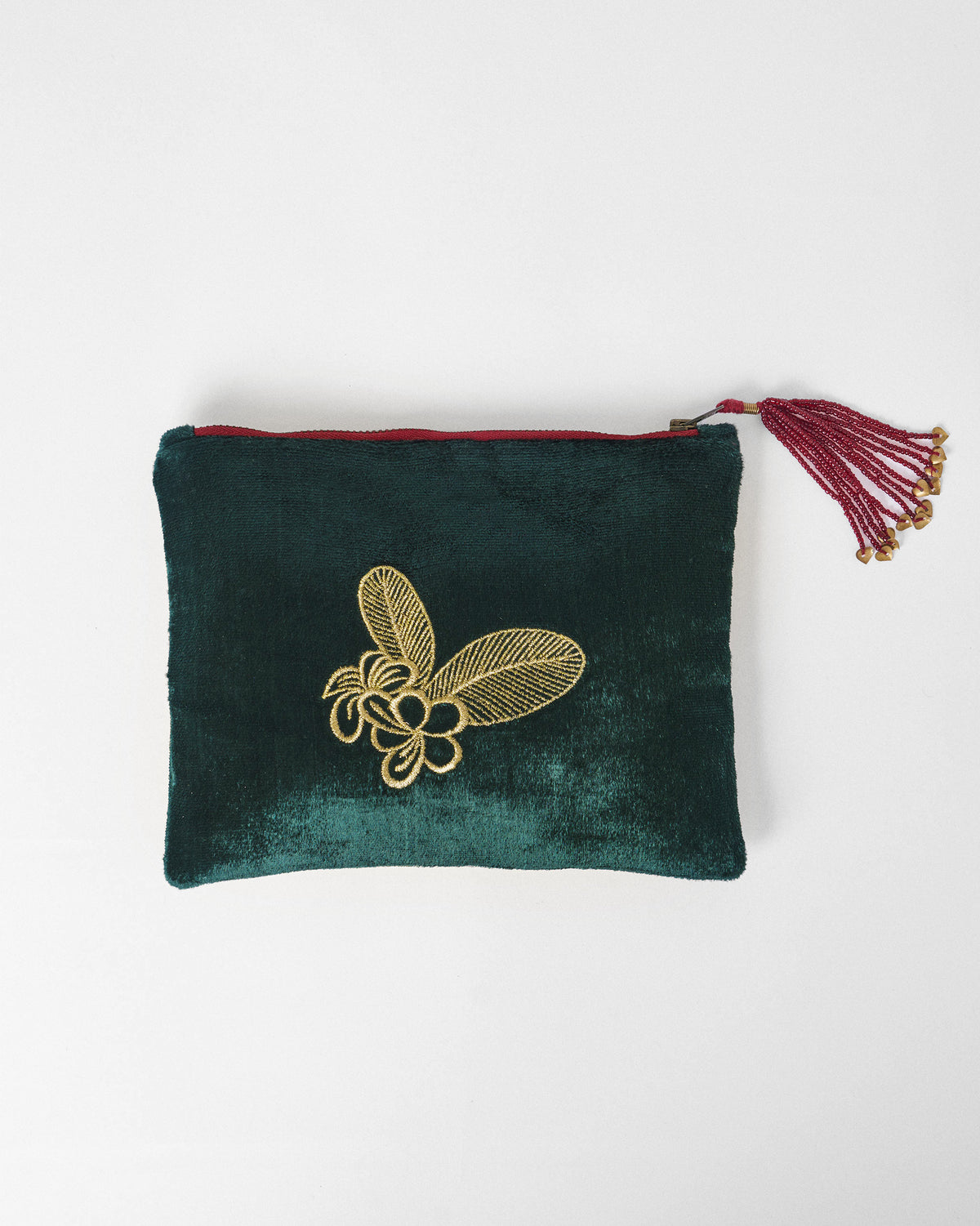 - The Plumeria Pouch is a small dose of festive charm, its deep green velvet surface brought to life with a single frangipani bloom.