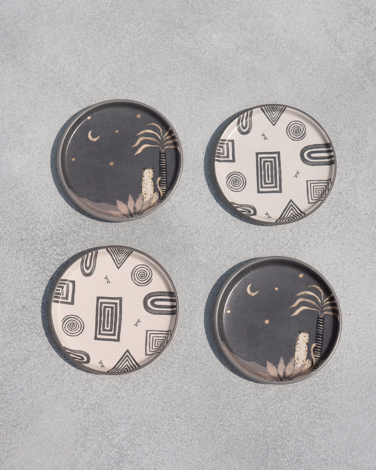 - The Serenity coasters, adorned with Nadira the leopard, are inspired by Zanzibar's vibrant nightlife. Complementing Nadira's lines, each coaster is adorned with geometric designs inspired by the historic doors of Stone Town.