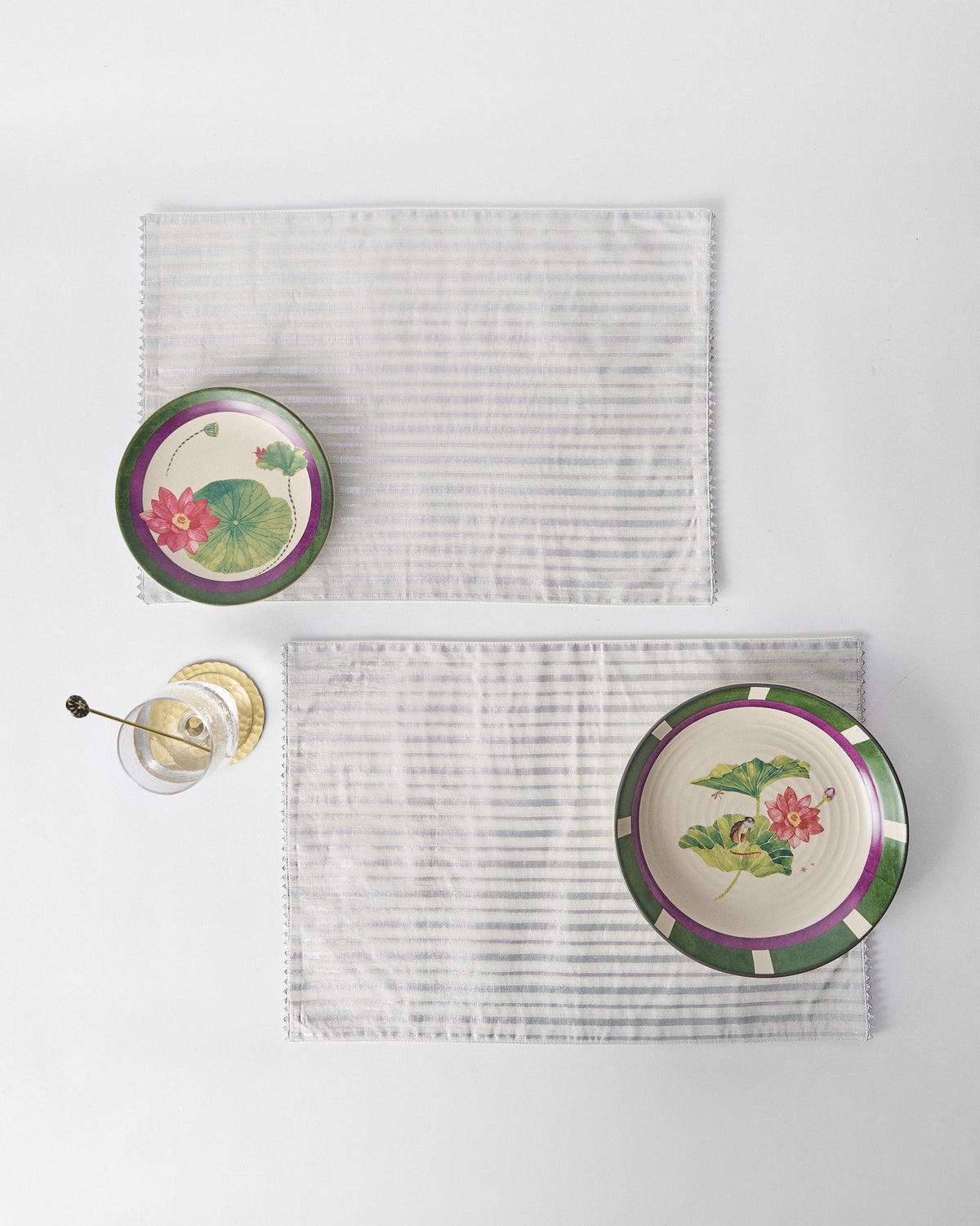 - The Silver Chanderi Placemats bring a festive glow to your table, with subtle silver stripes running across an ivory base.