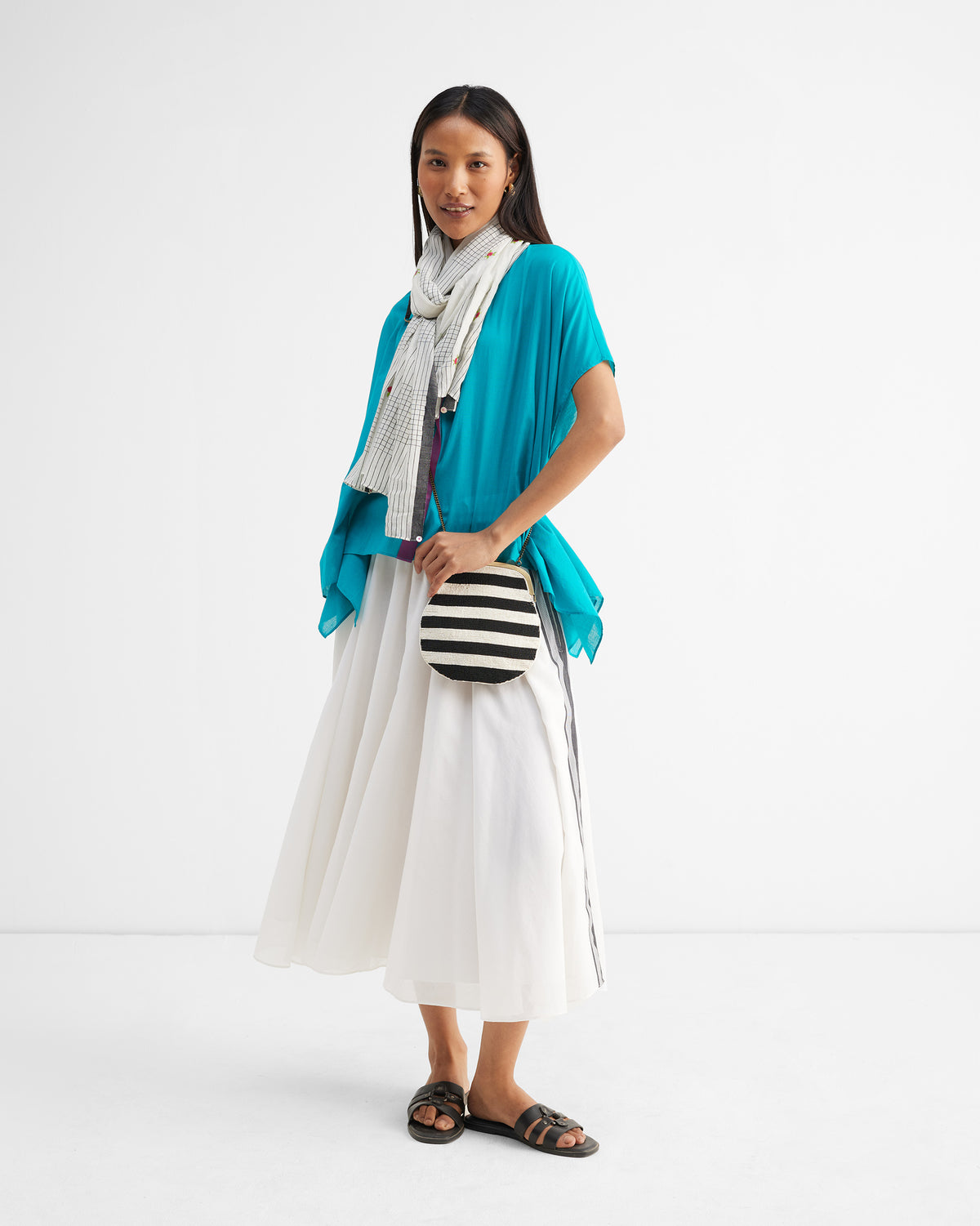 - With black and white beaded stripes, it’s a sleek statement that goes with everything.
