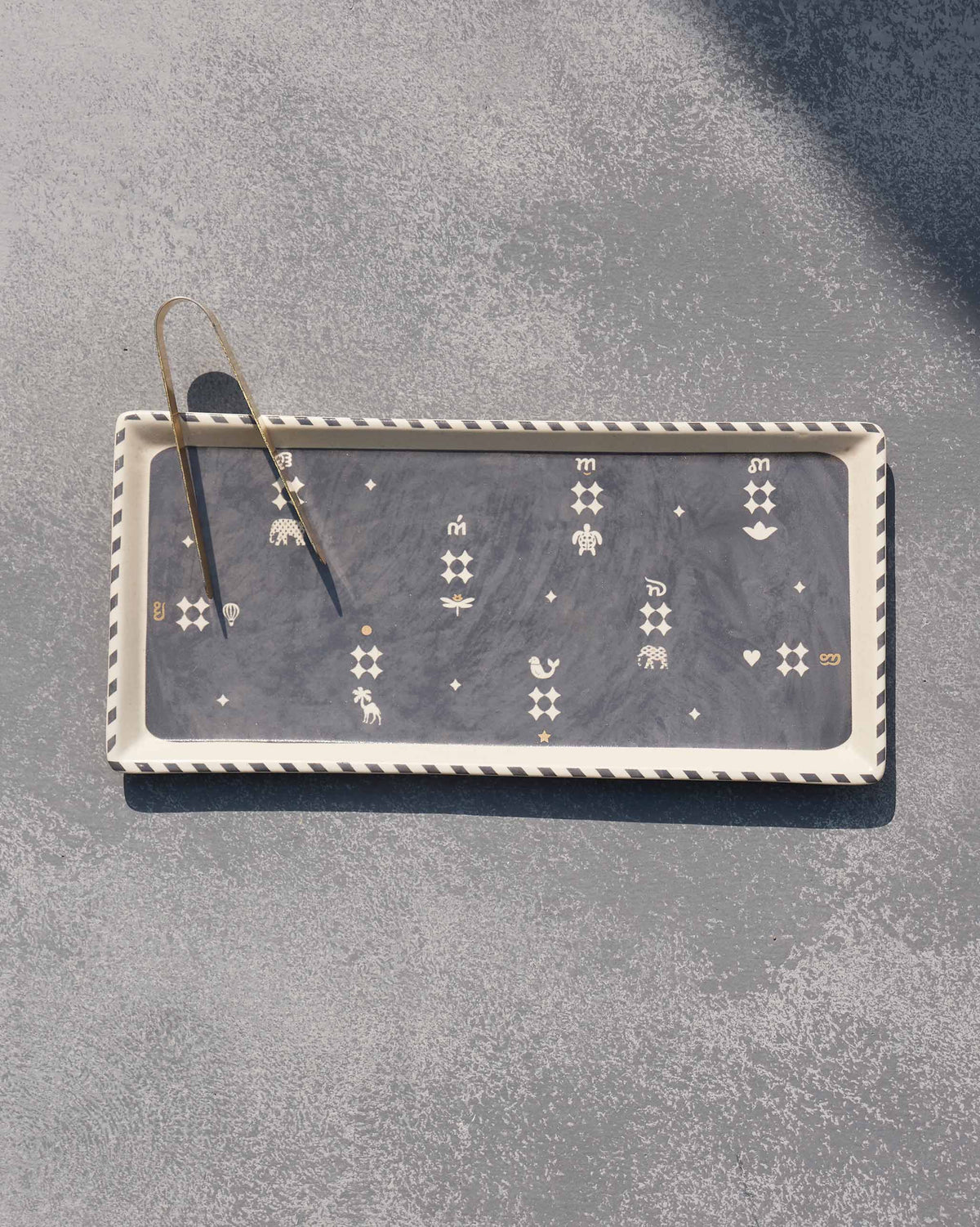 - A grey & gold stoneware cookie tray with brass-finished tongs