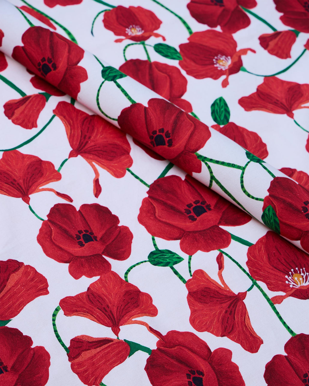 • The Poppy Garden fabric features bright, blooming poppy motifs in a palette of red and white. Adding a balance of colour and pattern to spaces, the design is intended to set a foundation for the rest of your interior setting.
