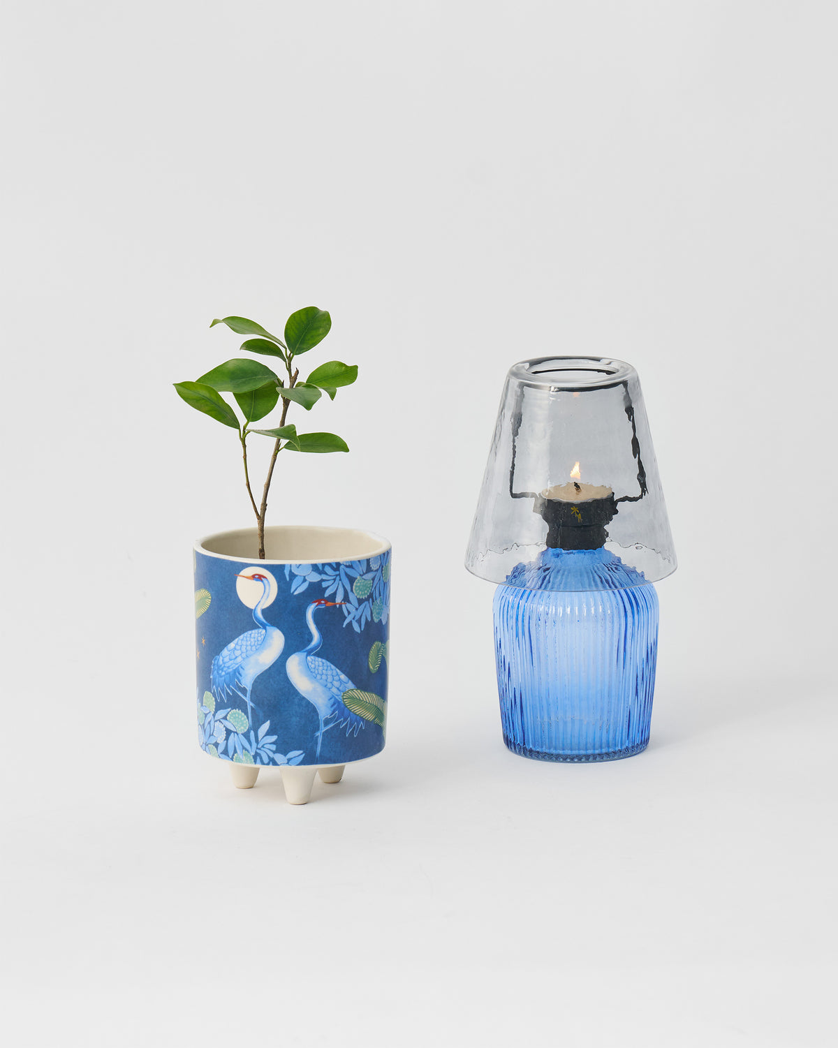 and the Lamp Votive. - A home for your plants, the Dancing Crane Planter features a pair of perched cranes against an inky night sky. In Japan, the crane (tsuru) symbolises longevity, good fortune, and spiritual harmony, embodying hope and peace. Its thousand-paper-fold tradition, senbazuru, is believed to grant wishes and healing.