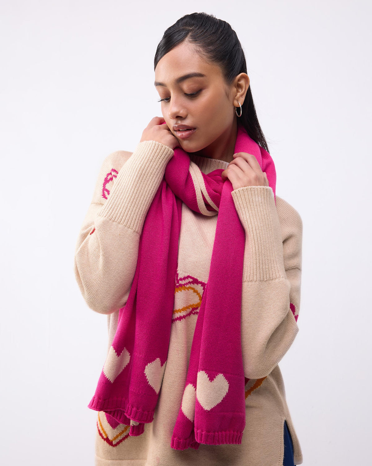- Both sides of the scarf feature three small hearts in an oatmeal tone.
