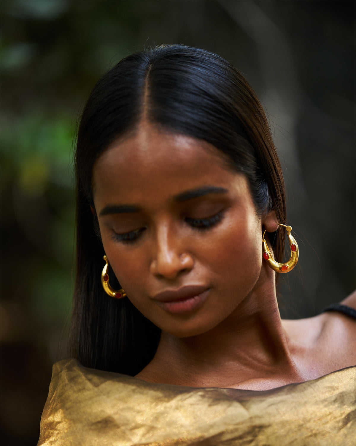 - The Carnelian Balis are studded with a total of 12 carnelian stones, its statement design making these a collector's pair. Carnelian is a stone that promotes courage and creativity.