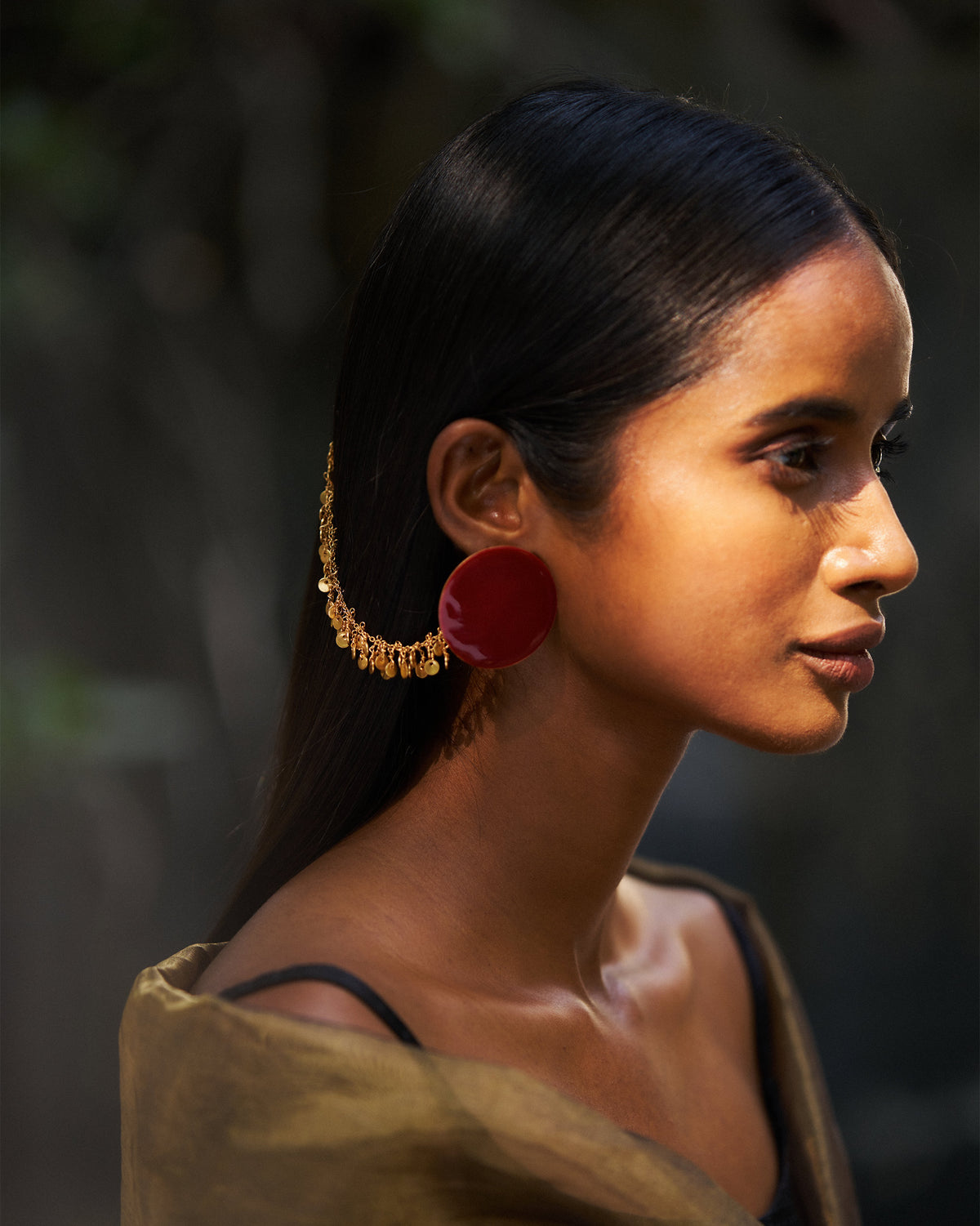 - This contemporary interpretation of a traditional red and shimmering gold hair ornament features enamel dot earrings crafted with flooded enamel on a brass circle. As an added touch, the earrings come with a versatile kanauti, or ear chain, which can easily be transformed into a bracelet or anklet.