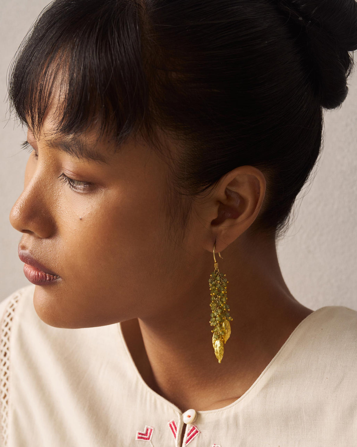 - Shoulder-grazing and statement, these danglers are cast in brass and plated in gold with cardamom charms.
