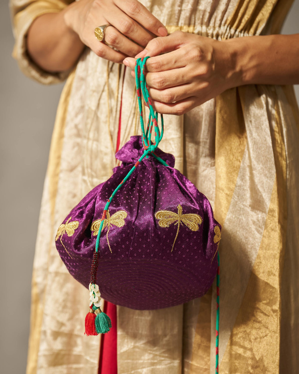 - Our Firefly Potli is the perfect finishing touch to your outfit, featuring a gold zari dragonfly stitched on a rich green base in viscose mashru and finished with a tassled details.