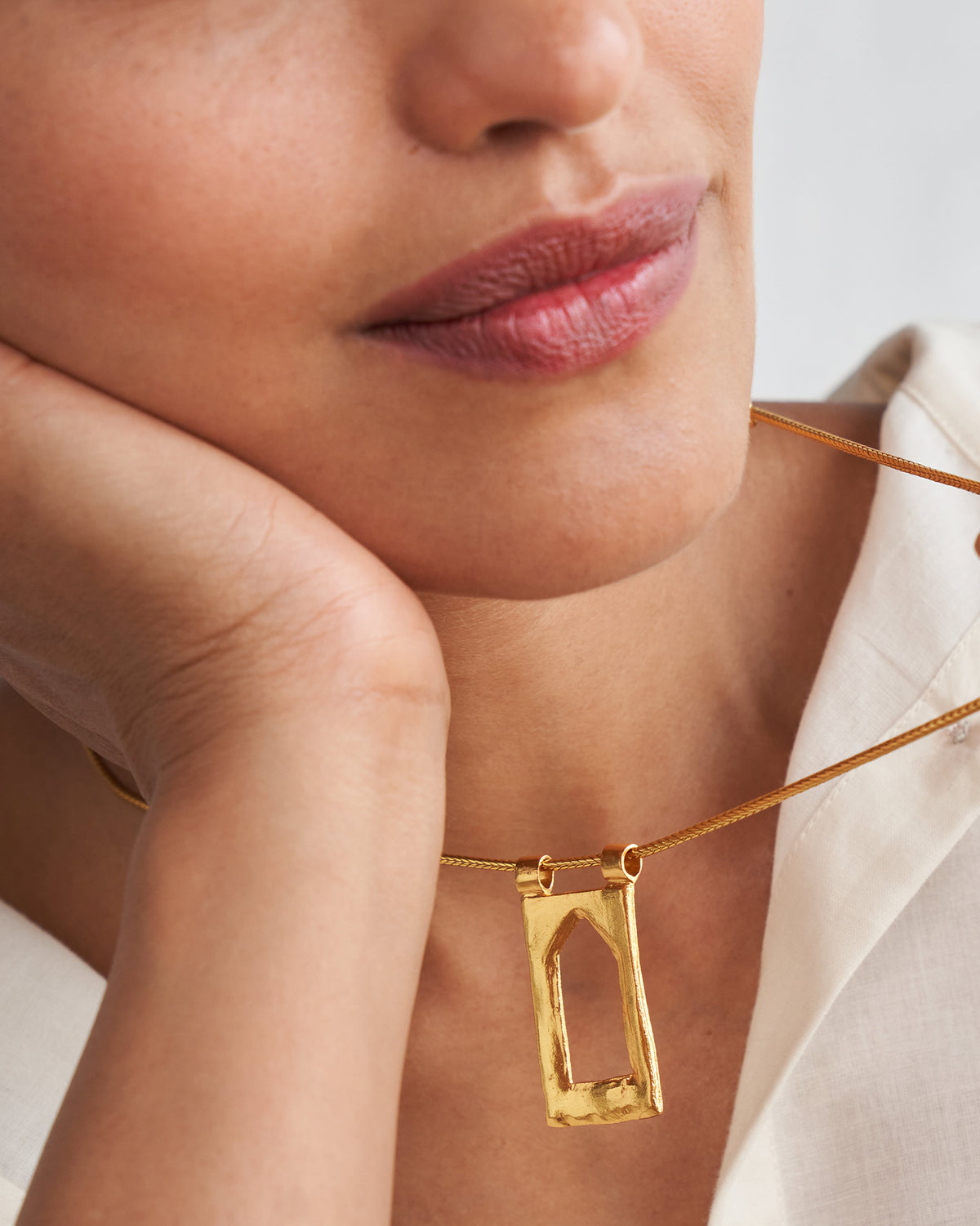 - Strung on a snake chain,the necklace is cast in brass and plated in gold.