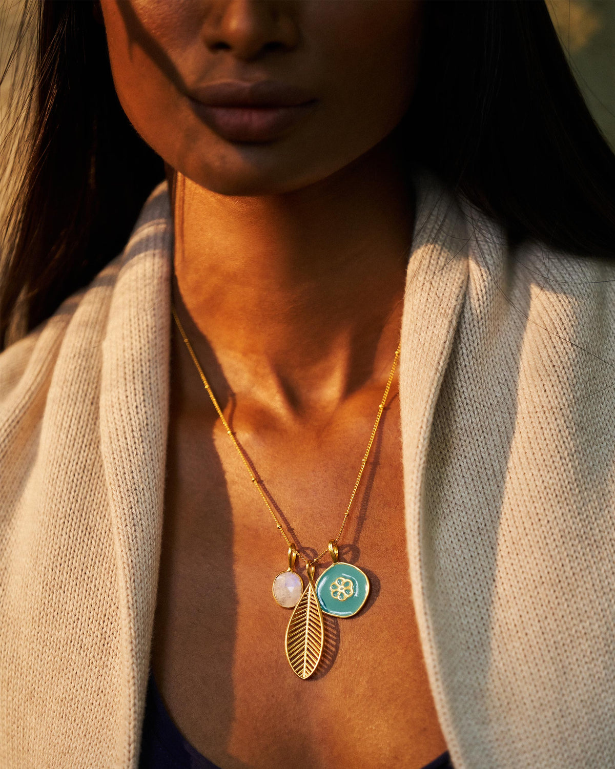 - The Kinship Necklace comprises of three charms, the blue colour from the ocean, moonstone from the heavens, and a frangi leaf from the jungle. This necklace represents harmony and togetherness.