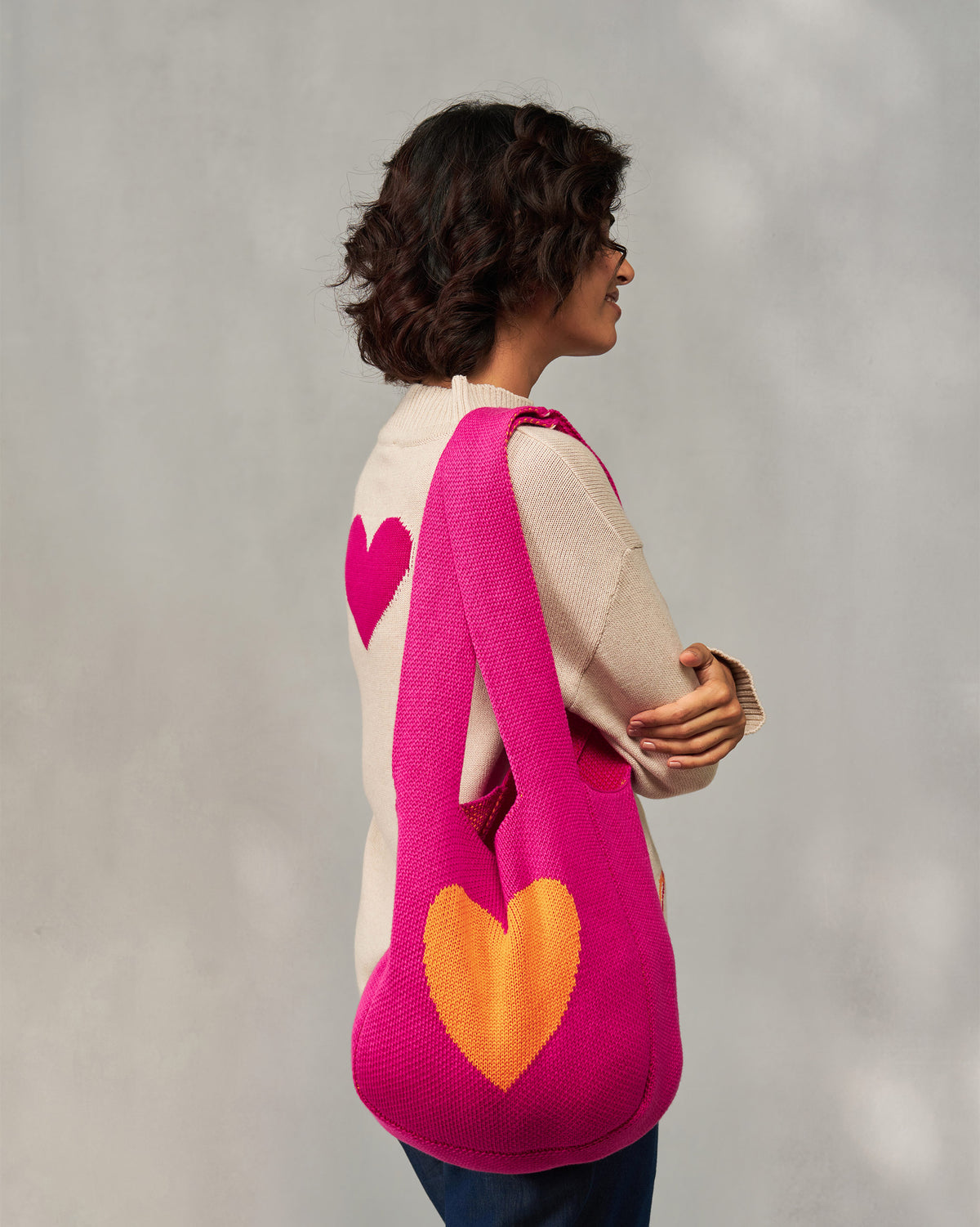 - This bag features a red heart on one side and a orange heart on the other, made with 100% organic cotton yarn in fuchsia, orange, and bright red.
