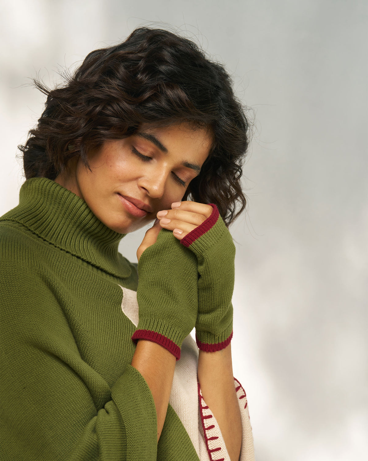 - The Luna Mittens in olive are crafted from 100% organic cotton yarn and feature red stripes along the edges for a stylish touch.