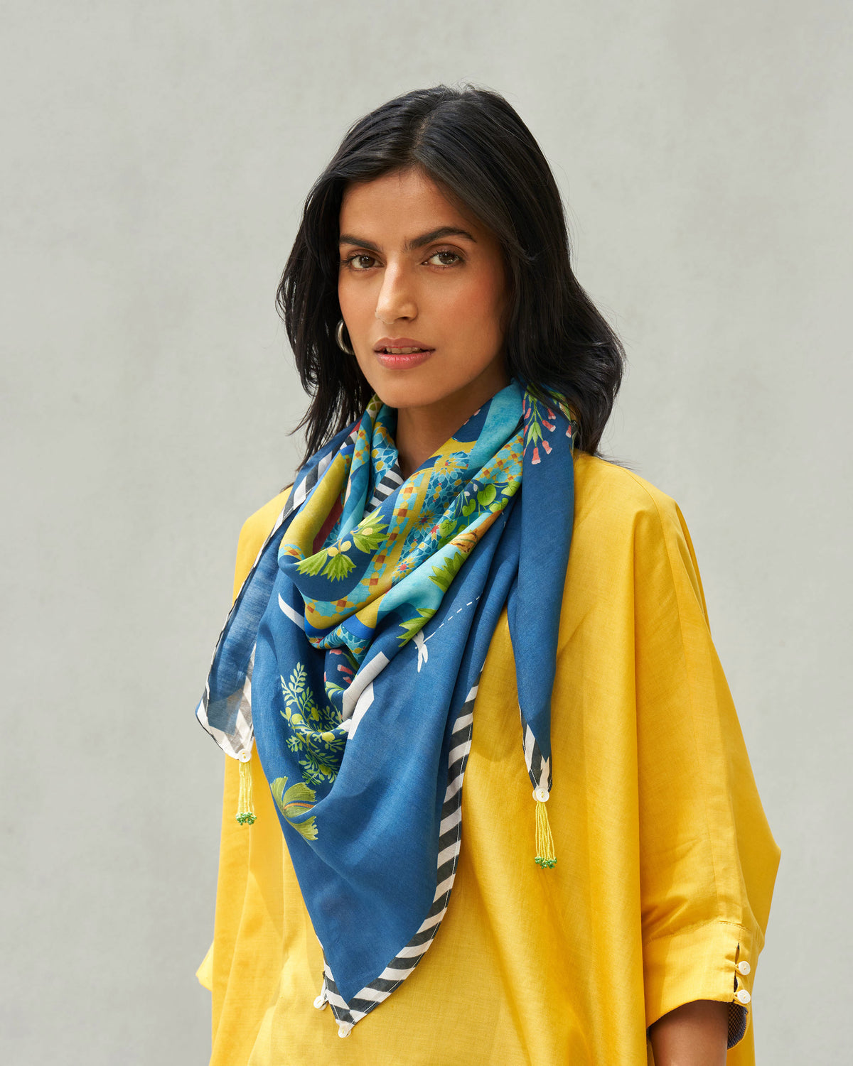 - A printed scarf in deep blue with motifs of carnival adventures inspired by our travels to Morocco.
