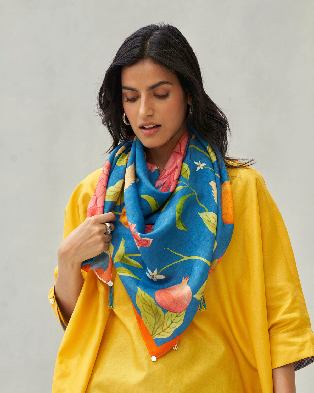 - A printed scarf in deep blue with lush motifs inspired by our travels to Morocco.