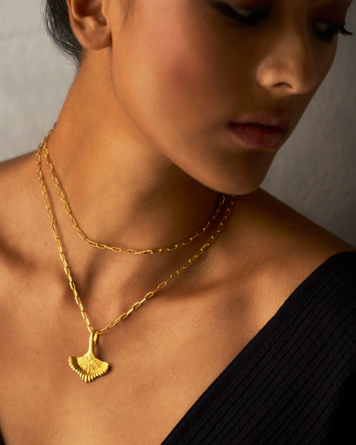 - The Palm Necklace keeps it casual and chic with a single pendant hanging from a simple chain. No fuss, just straightforward style. Crafted in brass and coated with a layer of gleaming gold, it adds a touch of laid-back luxury to your look.