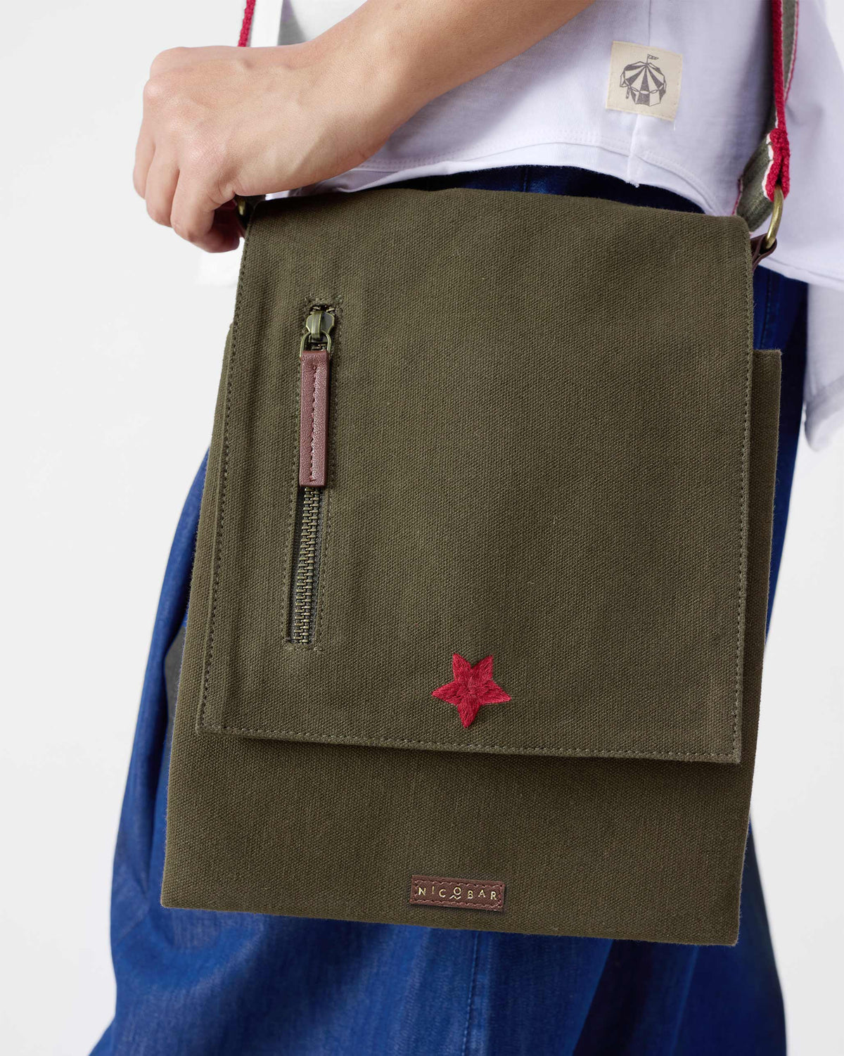 - Made from 100% cotton in olive, with leather trim details that add a refined edge.