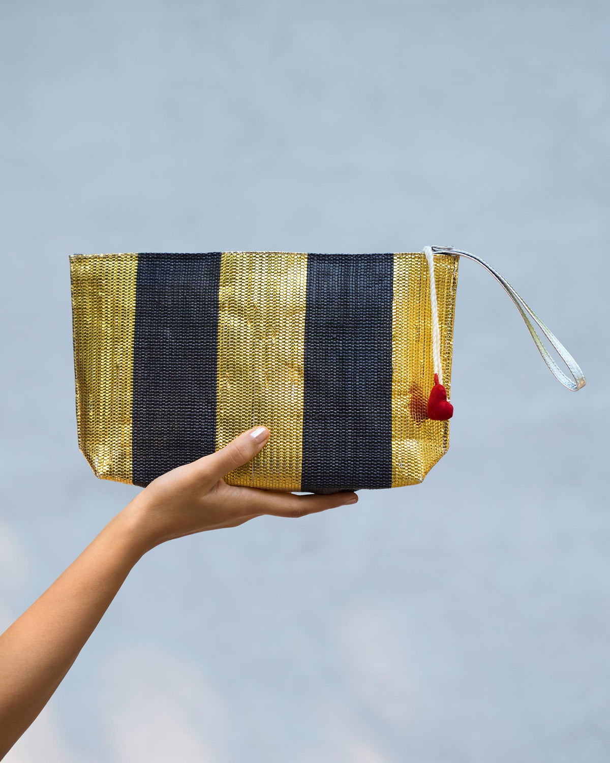 - Our Seher Clutch - Gold & Black is the perfect accessory to glam up your festive attire. Crafted from upcycled plastic, the design process embraces a sustainable, mindful practice by transforming discarded plastic into something beautiful.