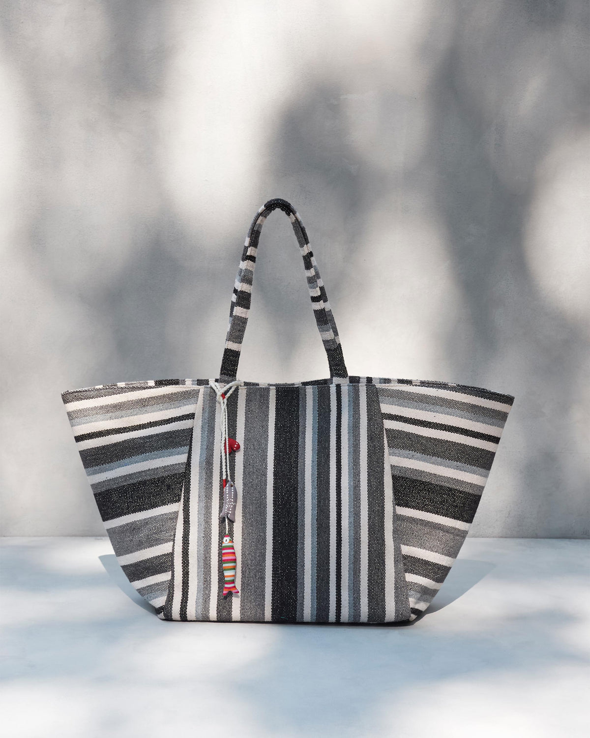 - A black and ivory striped spacious canvas tote bag for you to take far and wide.