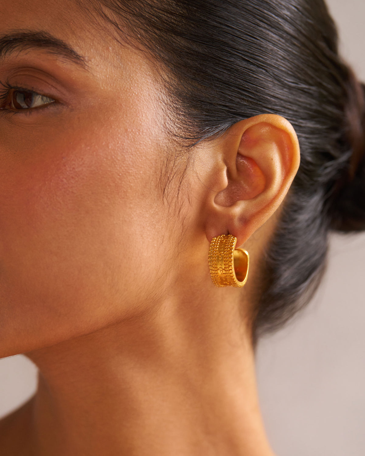 - Cast in brass and plated in gold, these statement huggies are made with lost wax technique.