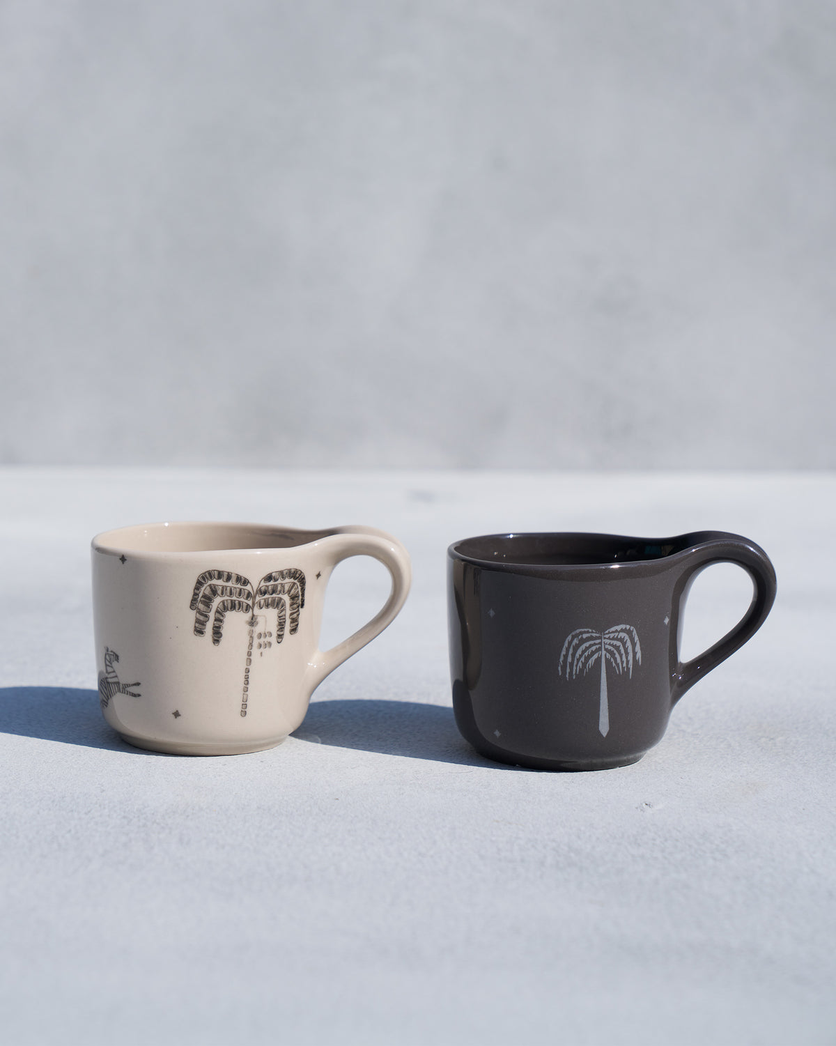 - The Zebra Mugs come in a charming, contrasting pair of ivory and charcoal with Zanzibar’s leaping zebras and swaying palms. The lightweight stoneware pair is great to give, great to keep!