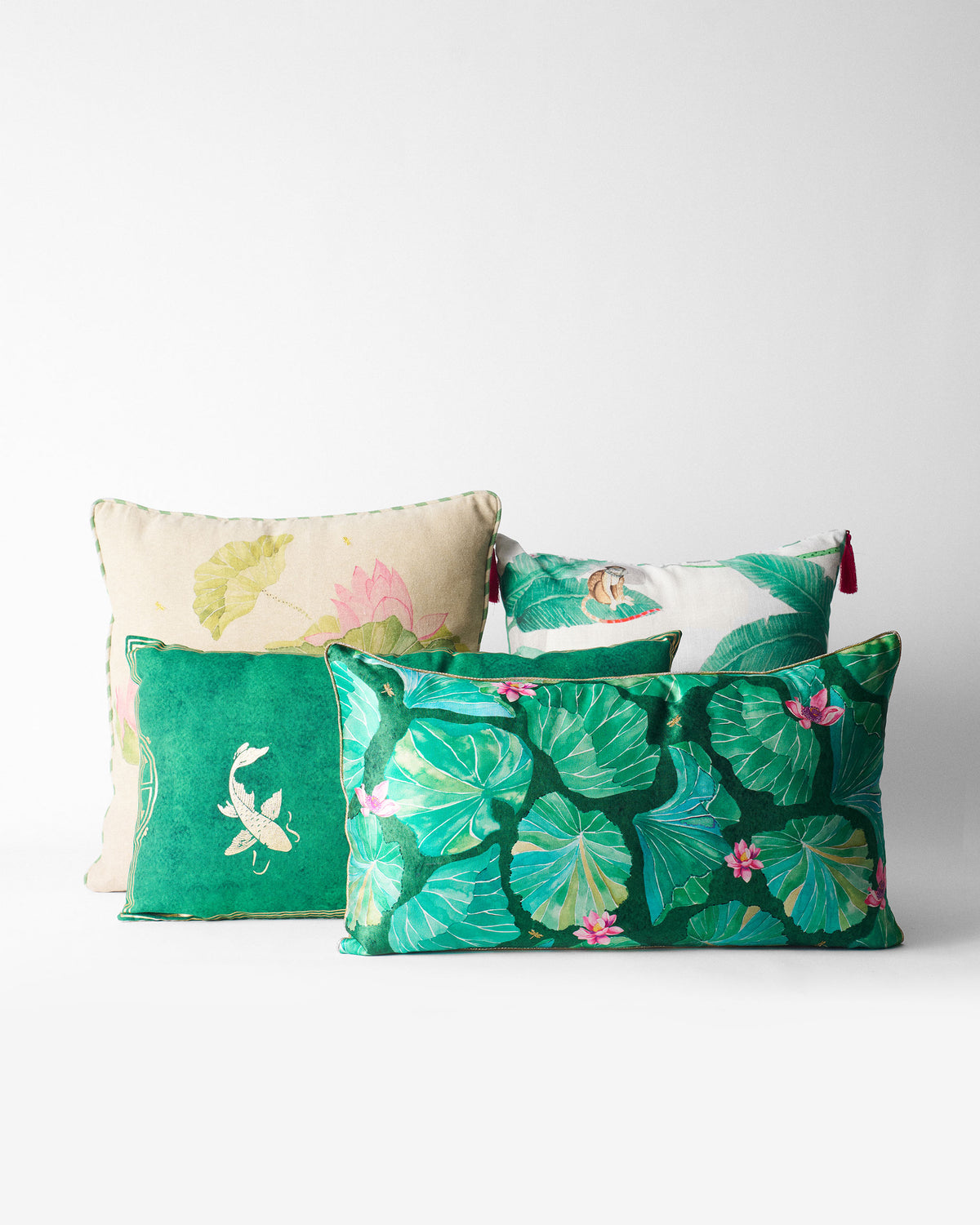 - The Lily Pond Cushion Cover, crafted in smooth mashru, features a calm garden scene with lily pads and blooming lotuses, accented by a delicately embroidered golden dragonfly.