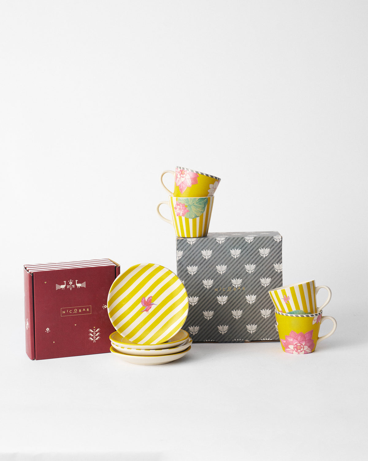 - The Lotus Garden Espresso Mugs feature two styles: one with bold yellow stripes and lily pads with blooming lotuses, and another with a solid yellow base, lotus clusters, and Nicobar’s signature stripes near the rim.