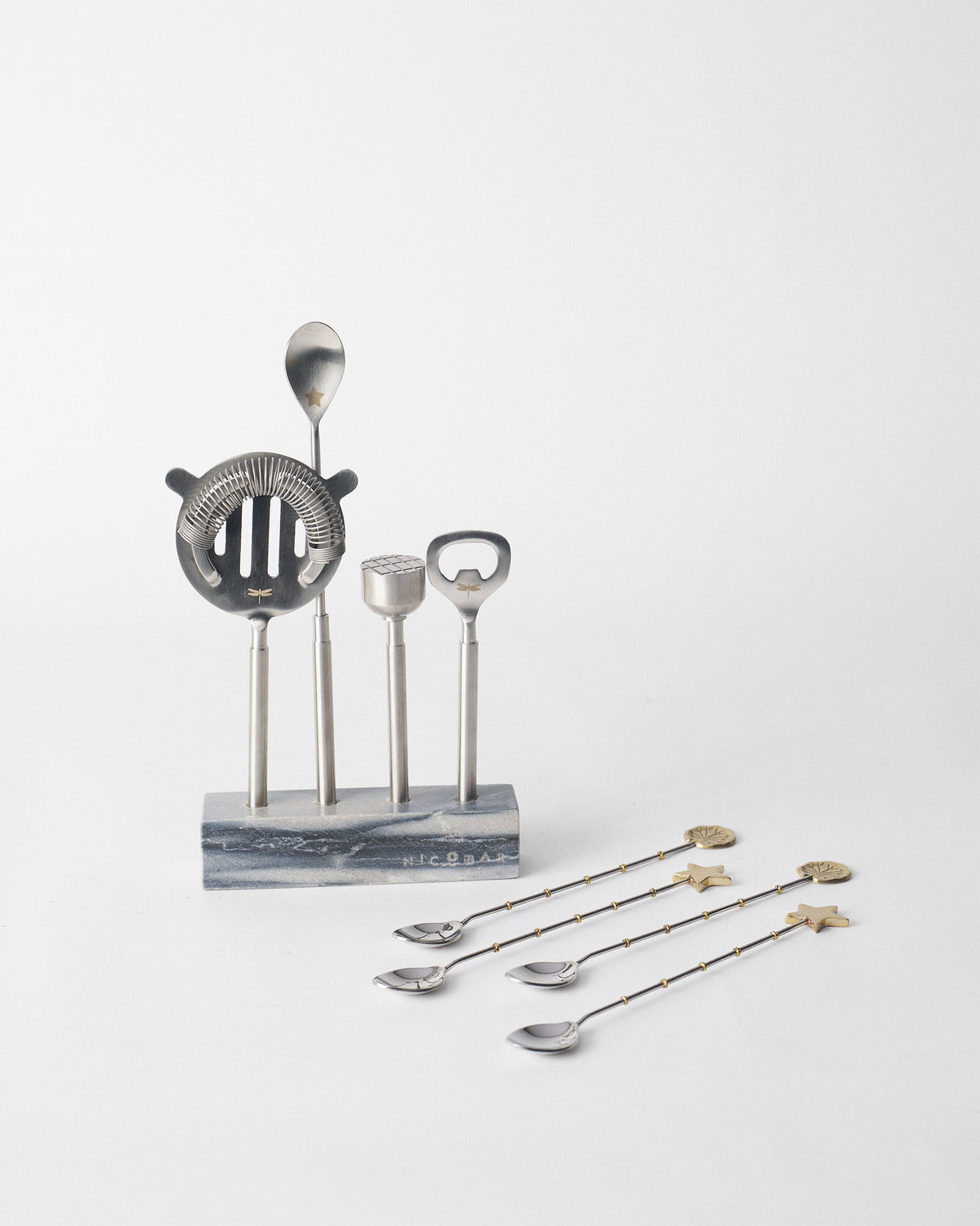 - The Oro Bar Tool Set pairs perfectly, with a muddler, strainer, opener, and spoon stirrer finished in gold and silver tones, all neatly housed in a charcoal marble base.