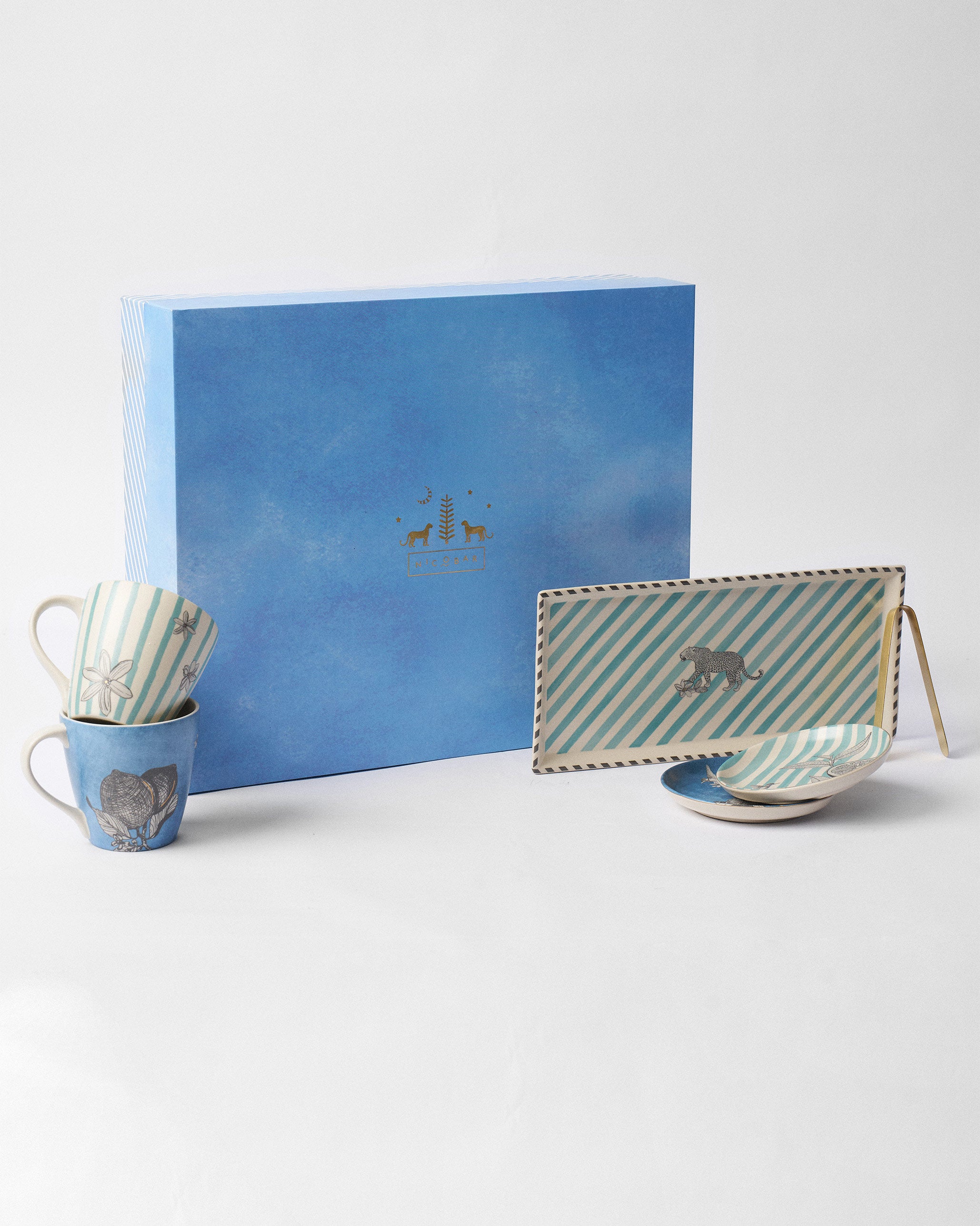 - It includes four tea plates and a cookie tray with matching tongs—crafted in stoneware and packed in a ready-to-gift box.