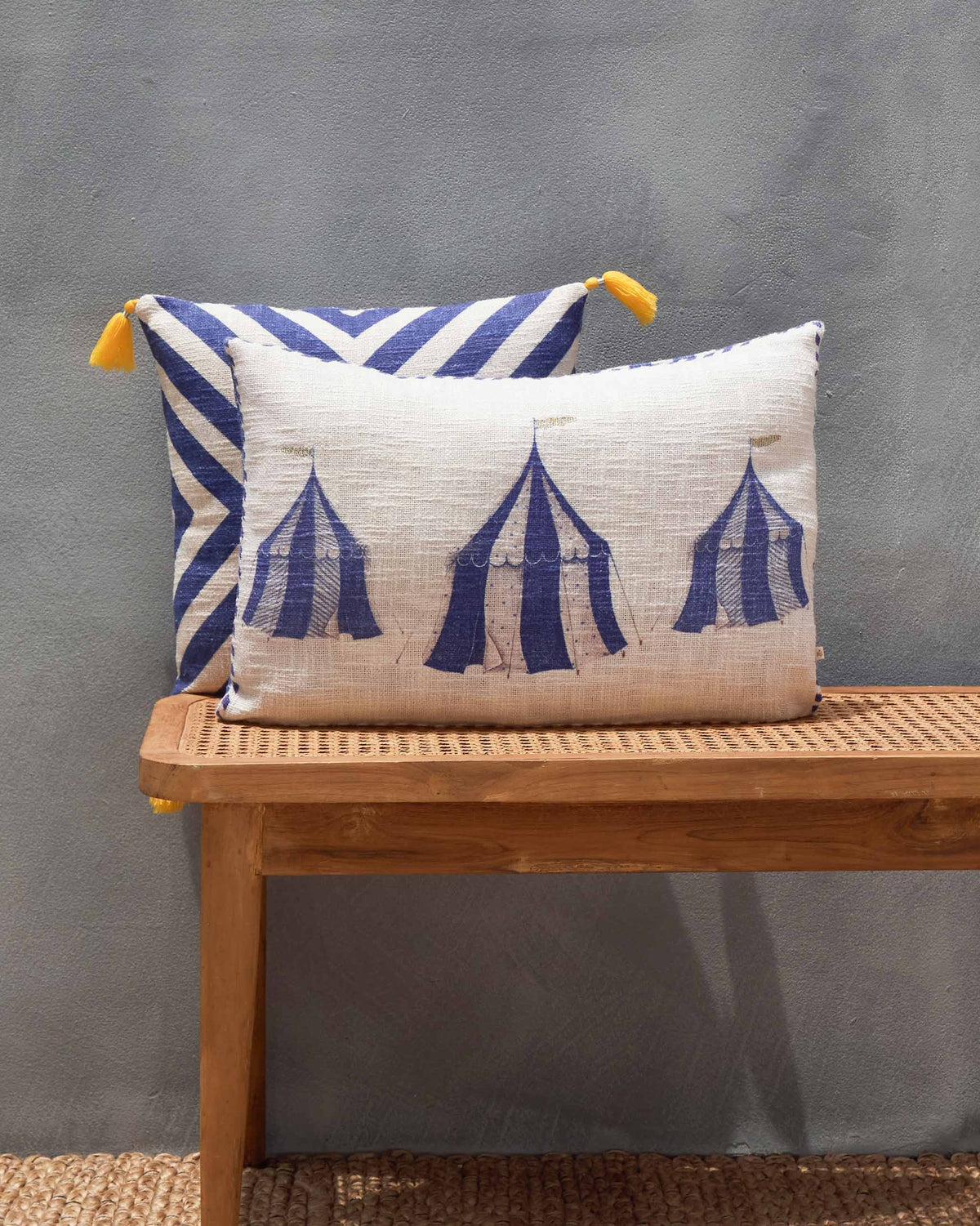 - The colours and textures of Morocco, the dreamy tents in shades of blue inspires the Azraq Lumbar Cushion Cover. The striped edge adds to its charm.