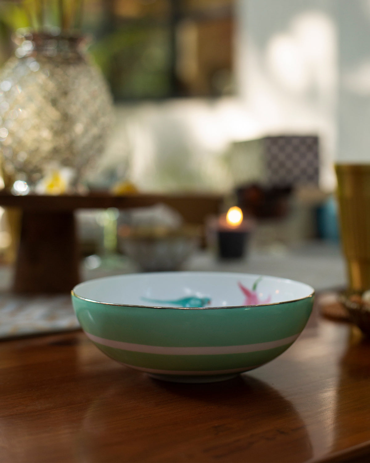 • A porcelain bowl with a glossy finish and little printed motifs picked from nature
