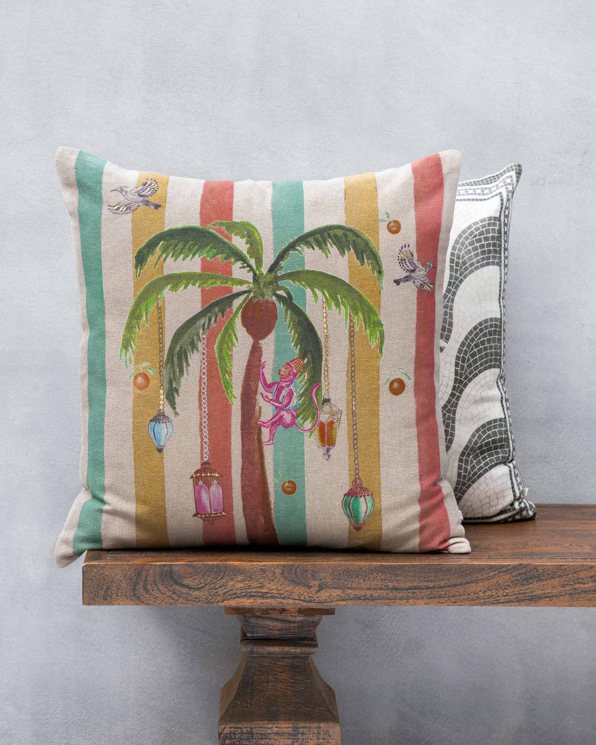 • The Chambray Palm Cushion is inspired by our travels to the beautiful city of Marrakech, featuring whimsical illustrations and a swaying palm against a striped background.