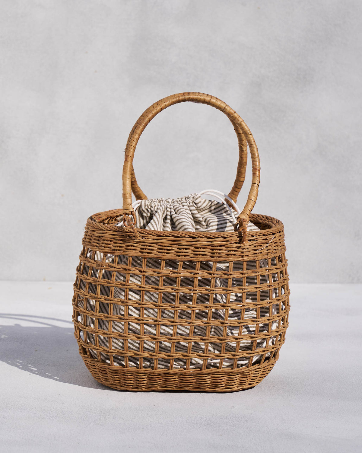 - Crafted in sturdy and rustic rattan, this basket features a roomy interior and large rounded handles to carry it with ease