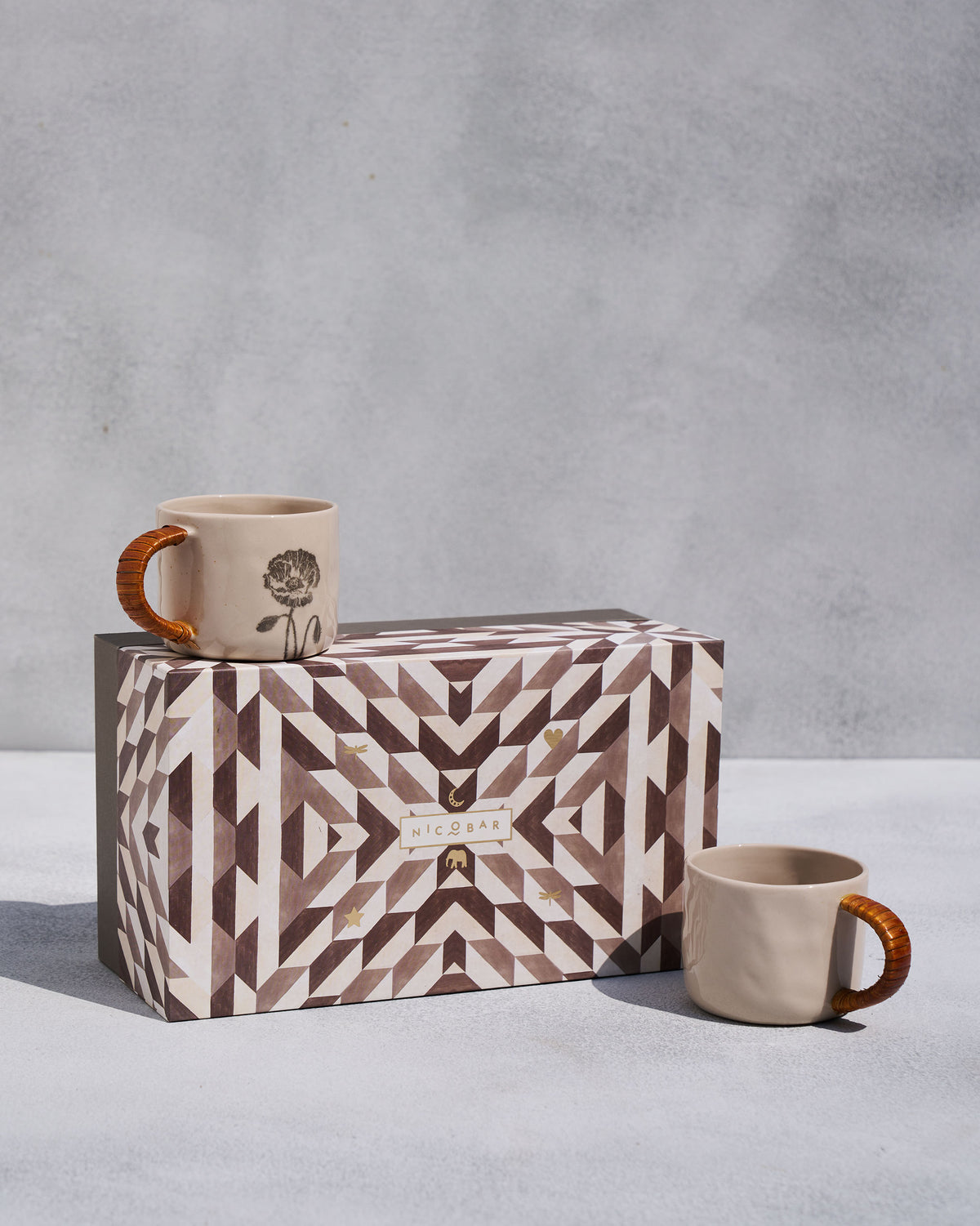 - Set of two mugs crafted in glazed stoneware with rattan handles that elevate