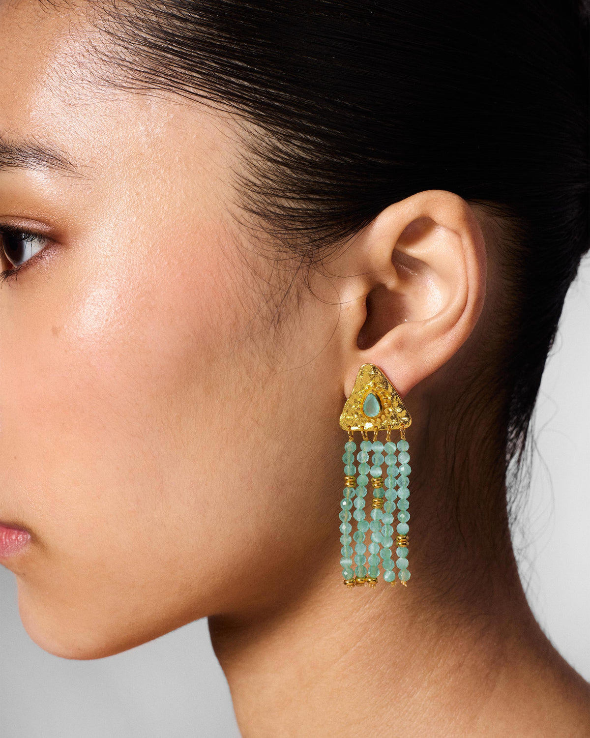 - Detailed with soft green glass beads that cascade gently, they echo the flow and rhythm of water.