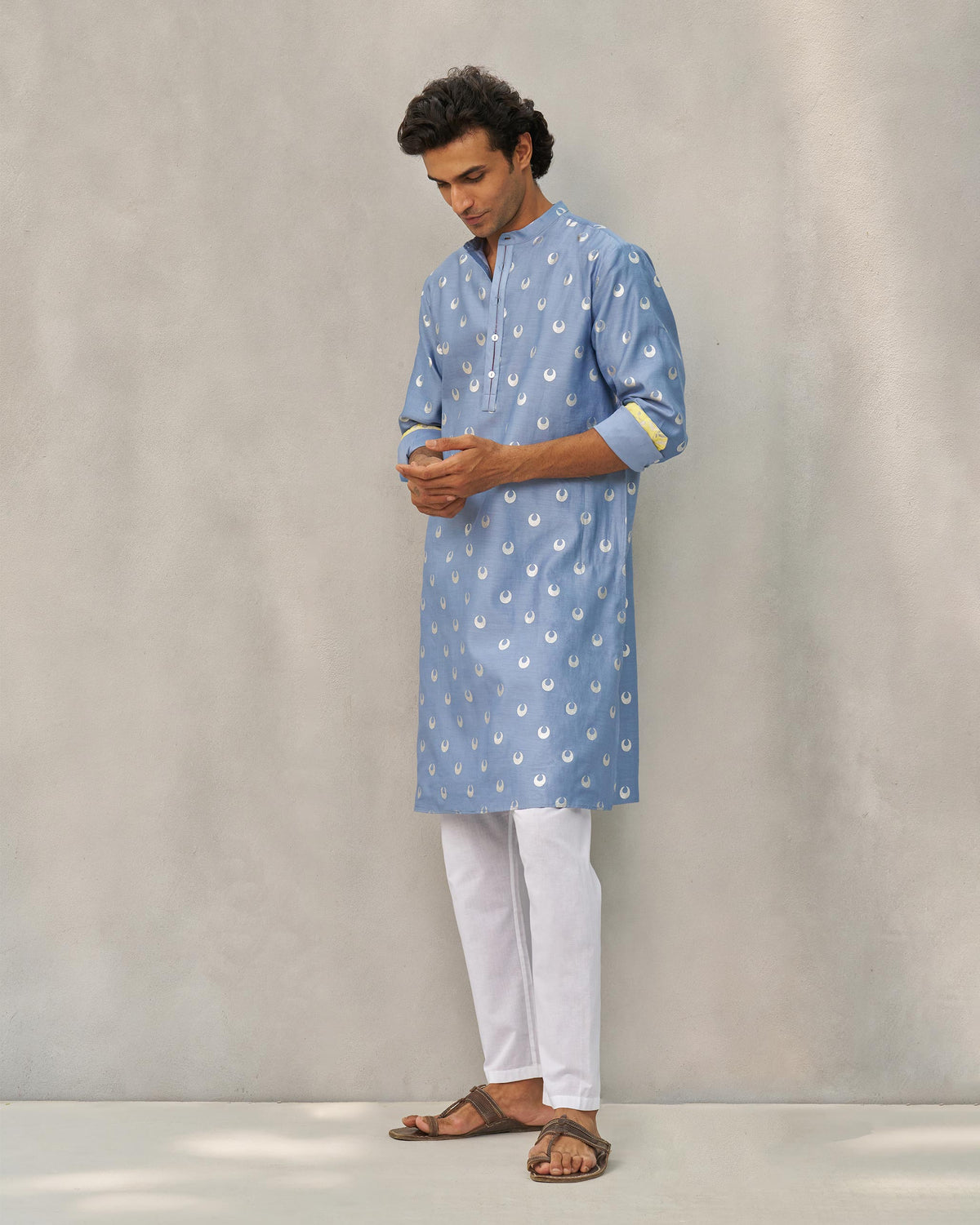 - Nothing says festive like a printed kurta. Our Astral Kurta features a classic fit and silver foiled moons against a soft blue background