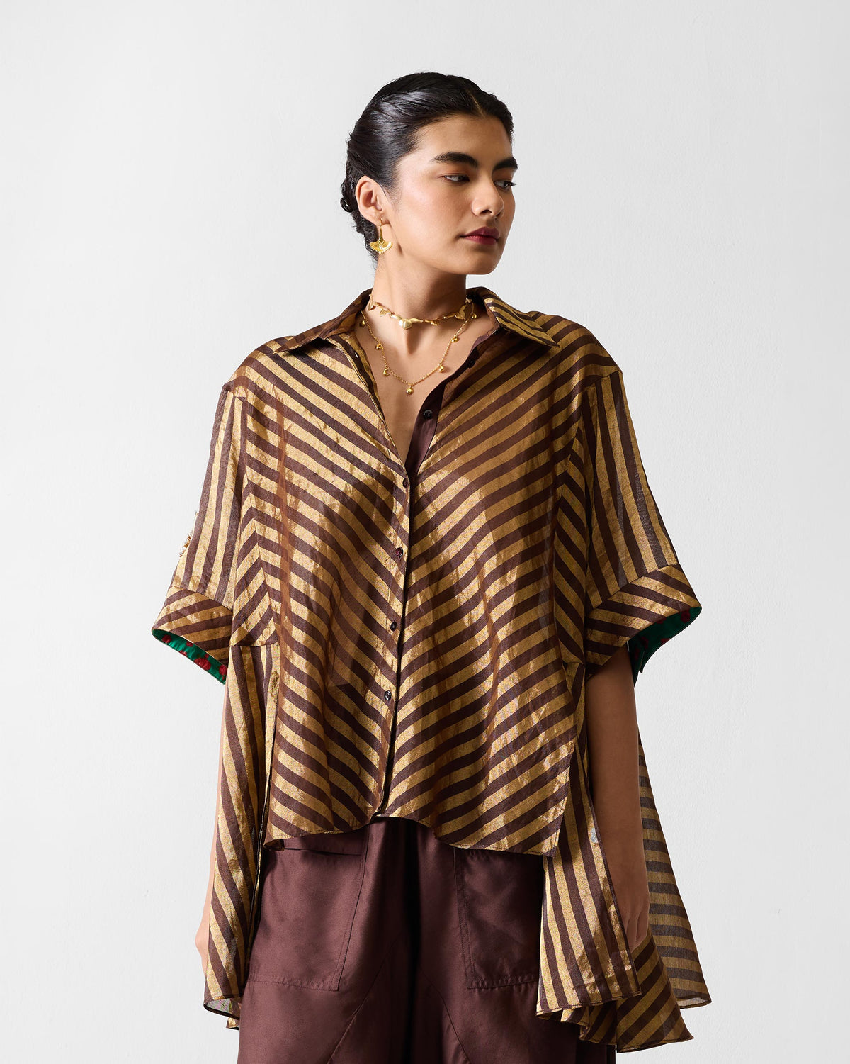 • The Ceylon Shirt marries rich textures with subtle opulence, crafted from metallic tissue that features deep chocolate brown accented with shimmering gold stripes. The interplay of these tones lends the shirt a warm, sophisticated glow.