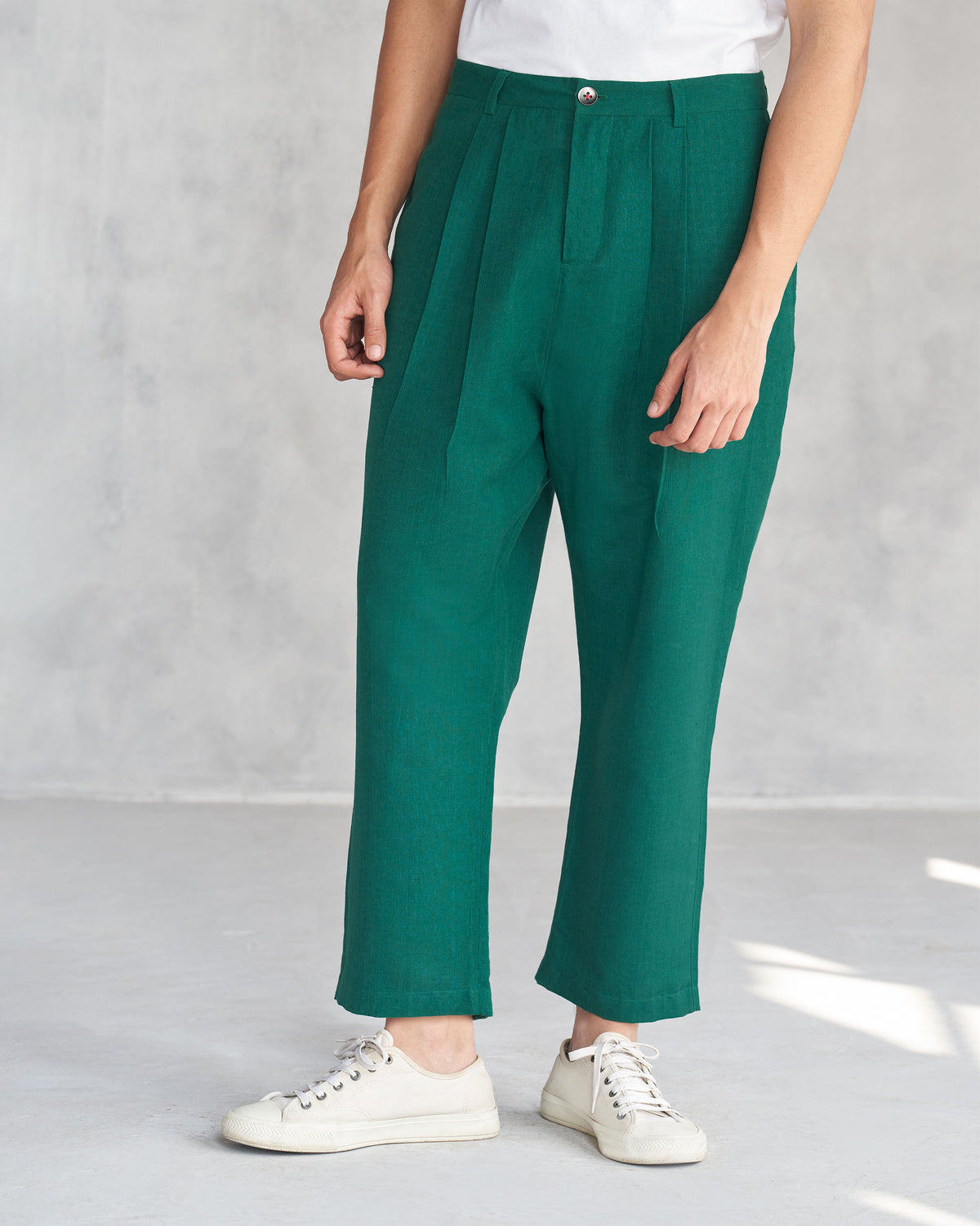 - Ditch discomfort and embrace the slouch! Crafted in linen cotton and complemented by a contemporary touch with the wide bottom hem, these pants offer both style and movement throughout your day.