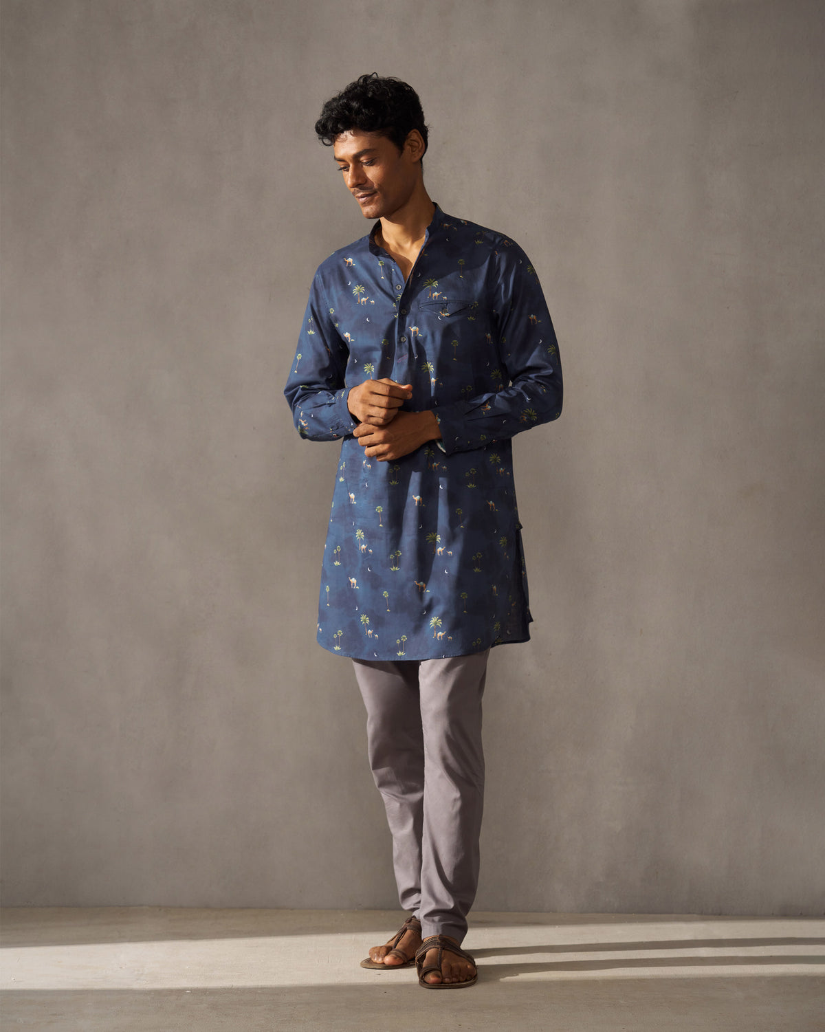 - The deep navy kurta features motifs inspired by our travels to Marrakech.