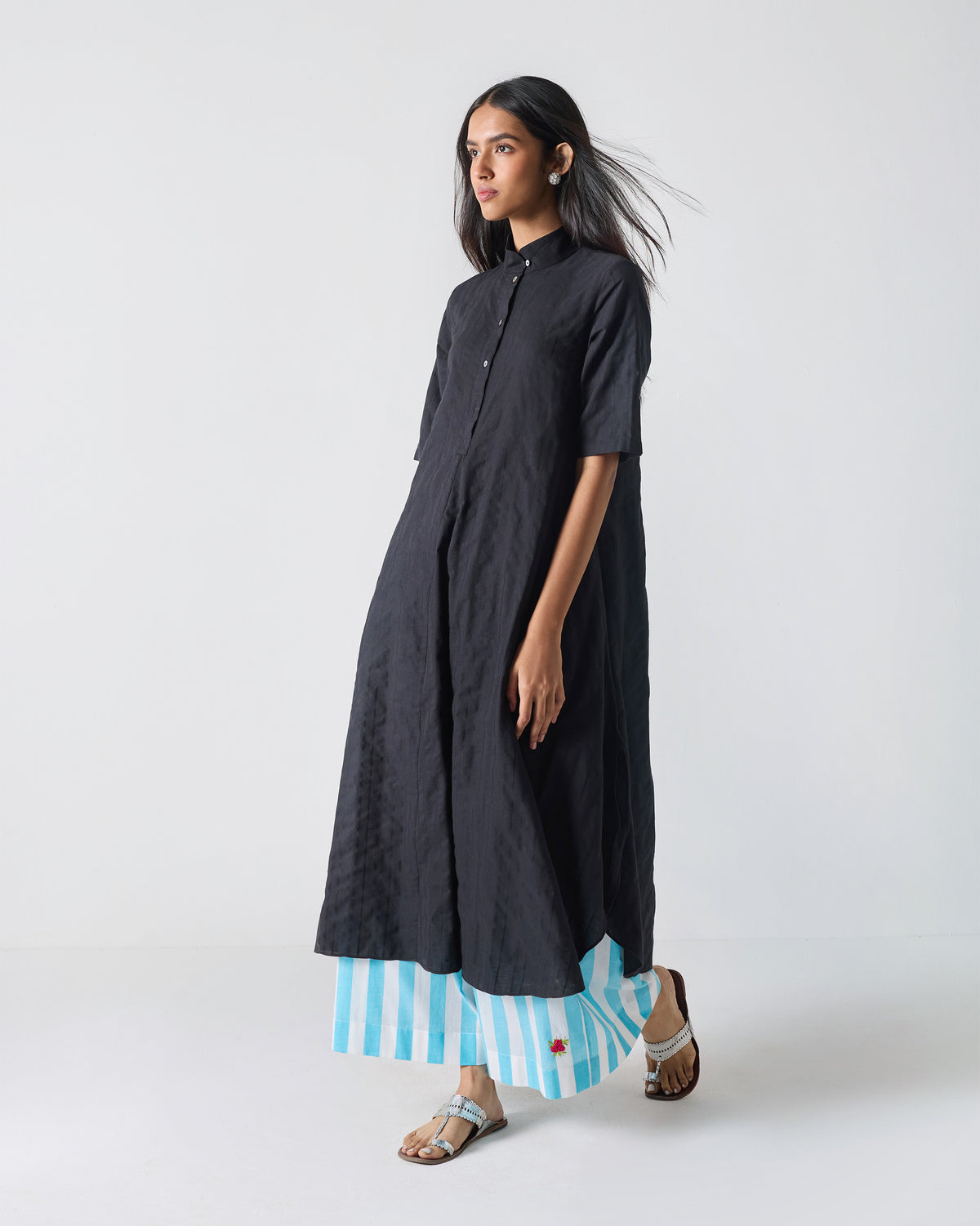 - The Gusset Slit Kurta is a modern, sophisticated piece with a striking blend of texture and detail. Crafted from 100% yarn-dyed cotton, the kurta features a solid black jaal pattern with alternating thick and thin stripes, creating dynamic visual interest.