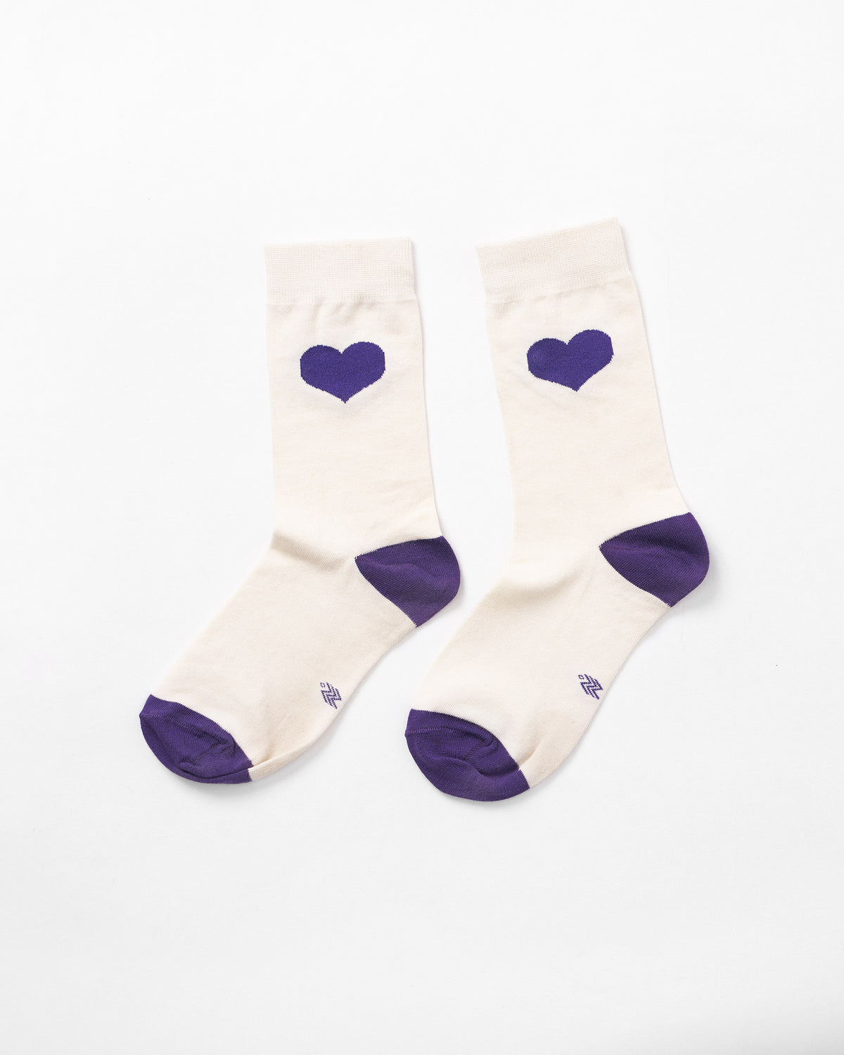 - These socks, crafted from 100% cotton in oatmeal and purple, feature hearts on each sock.