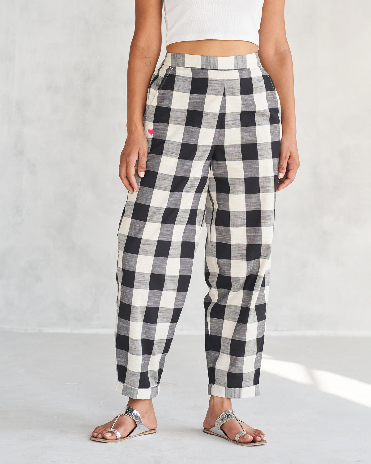 - The big black and ivory checks in these comfortably fitted pants offer timeless appeal. Look out for the berry heart on the right side.