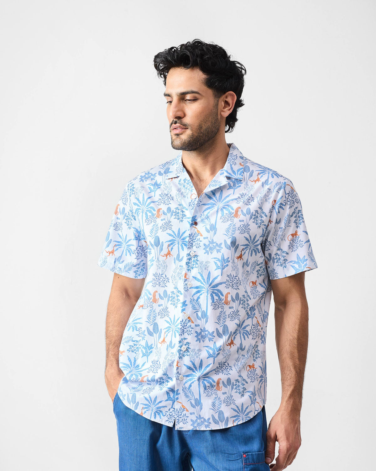 - This 100% cotton shirt is a walk through the wild—monkeys, birds, and trees printed across a blue-grey base that’s equal parts untamed and refined. Blending the calm of the desert with the wild spirit of the jungle, Safar is a collection designed for exploration—capturing the journey within, before it even begins.